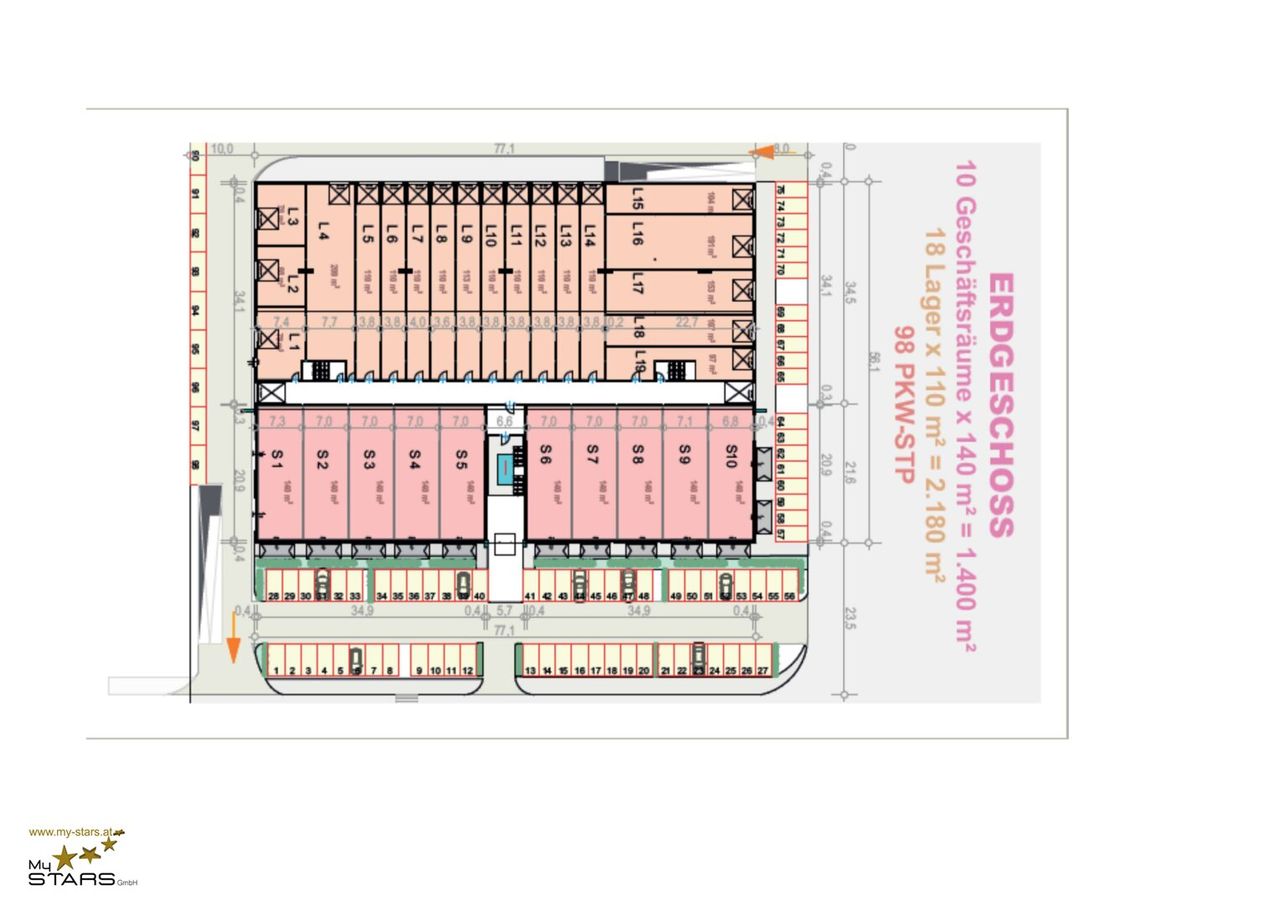 18 Lagerflächen x ca. 110 m² + 98 PKW-Stellplätze im Erdgeschoß