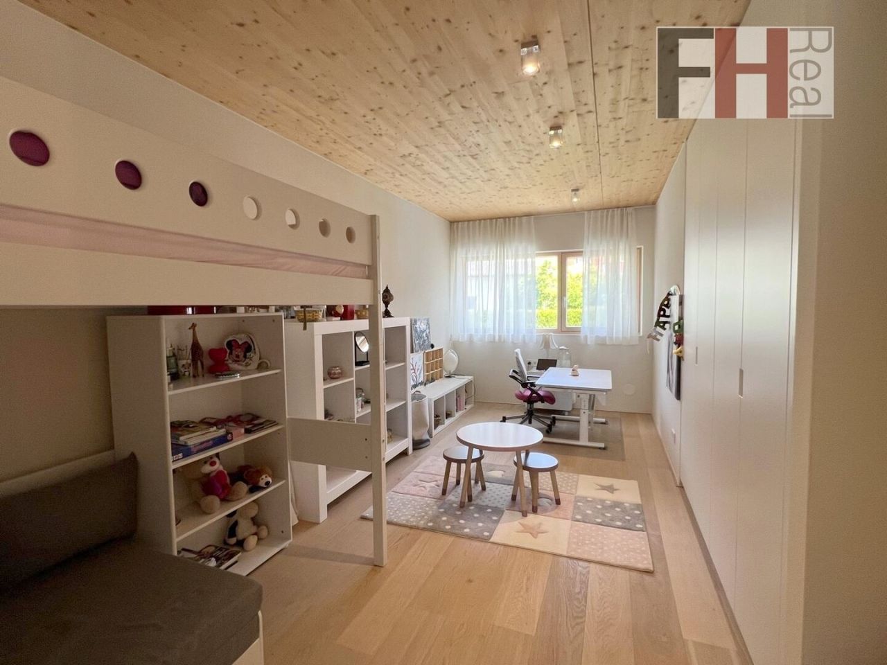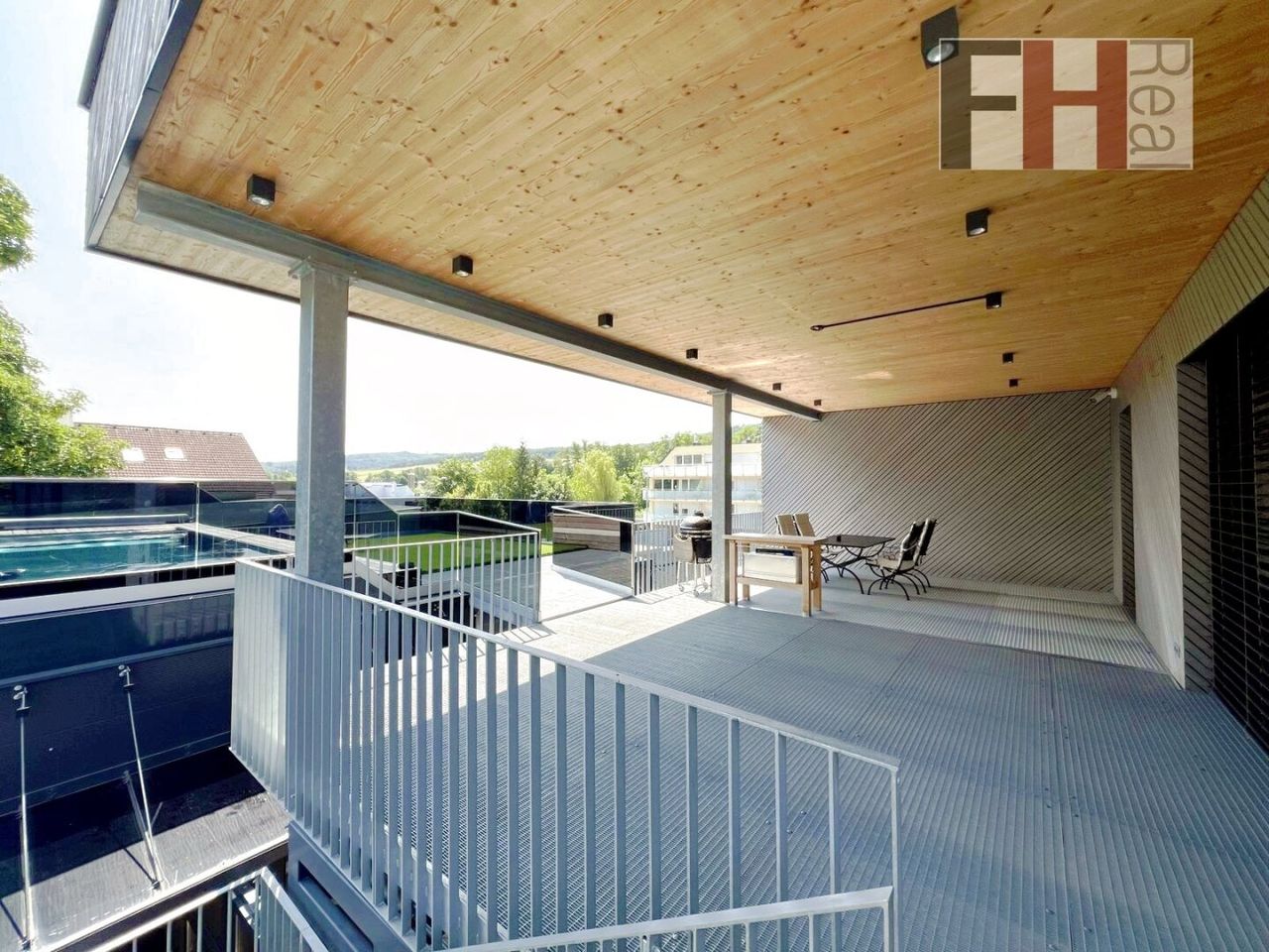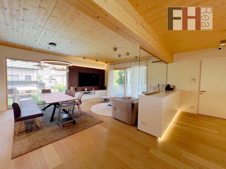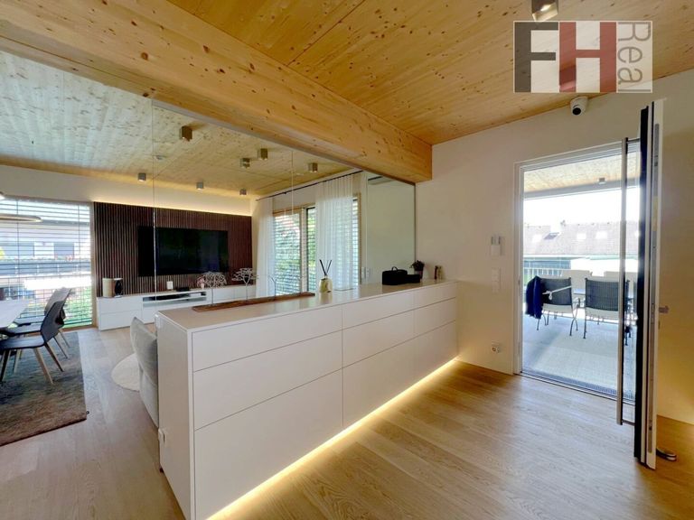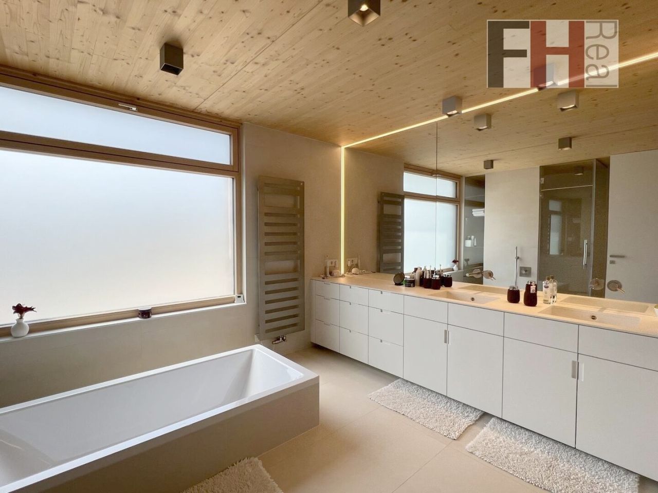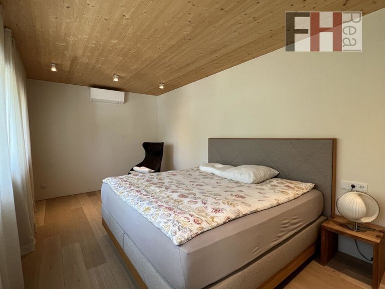 Über einen Vorplatz und dem Stiegenaufgang gelangt man direkt auf den Balkon, den Pool und zum Eingang. Der Grundriss der gesamten Fläche ist nahezu ideal, Der repräsentative Empfangsbereich mit offener, moderner Küche wurde mit knapp 64m² sehr großzügig gestaltet. Die 5 Räume sind zentral begehbar und weisen Größen von knapp 10m² bis zu 17,5m² auf. Ein Bad mit Dusche und Wanne, Doppelwaschbecken und Toilette sowie eine zusätzliche Toilette im Empfangsbereich komplettieren das Raumangebot. Die großen Fensterflächen sind 3-fach verglast, beschattet wird durch außenliegende Lamellenraffstores. Eine Luftwärmepumpe versorgt die Liegenschaft mit Warmwasser, ein Festnetzanschluss und eine Satellitenschüssel sind vorhanden. Die moderne Photovoltaik-Anlage mit großzügig dimensionierten Speichern sorgt dafür, dass die ganze Liegenschaft besonders effizient betrieben werden kann.