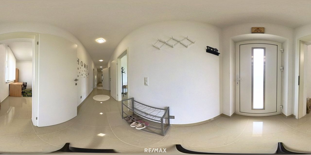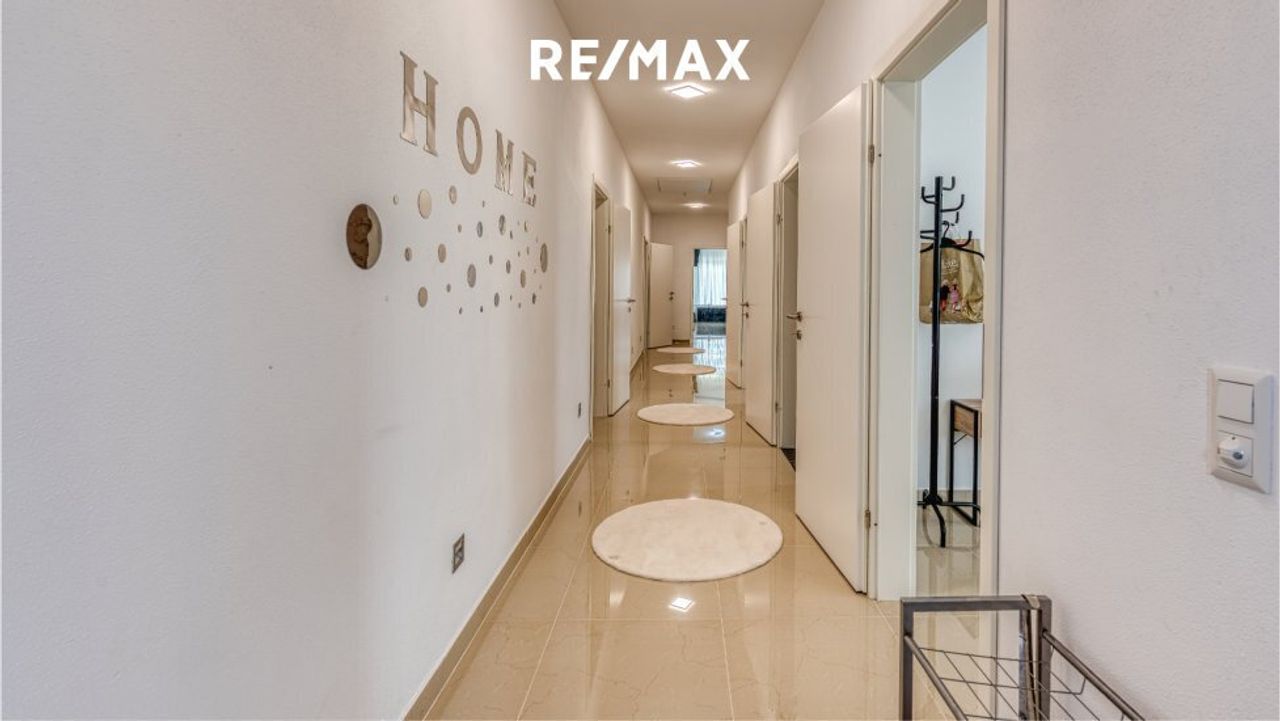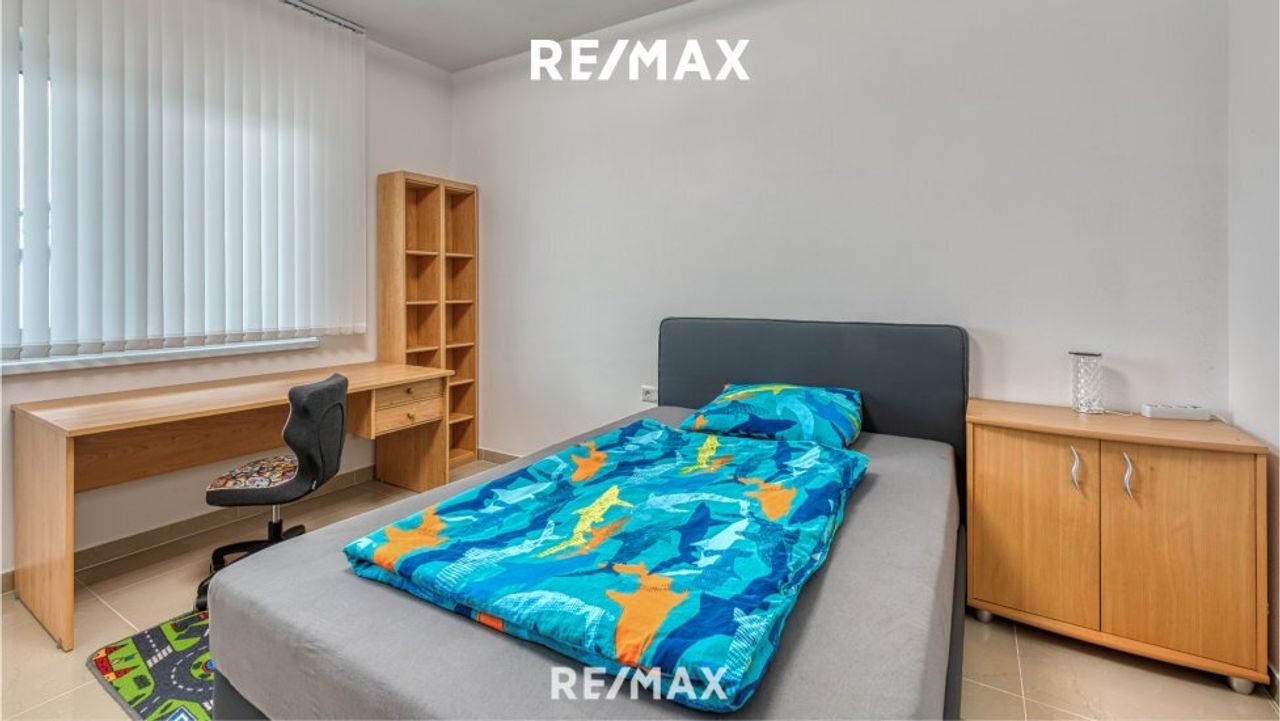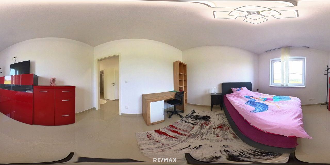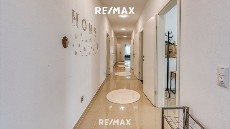 Ein Elternschlafzimmer mit Schrankraum und eigenem Badezimmer mit WC. Zwei weitere Schlafzimmer und eine extra Dusche mit WC stehen für die Familie und die Gäste zur Verfügung. Ein weiteres Zimmer ist als Büro benutzbar.