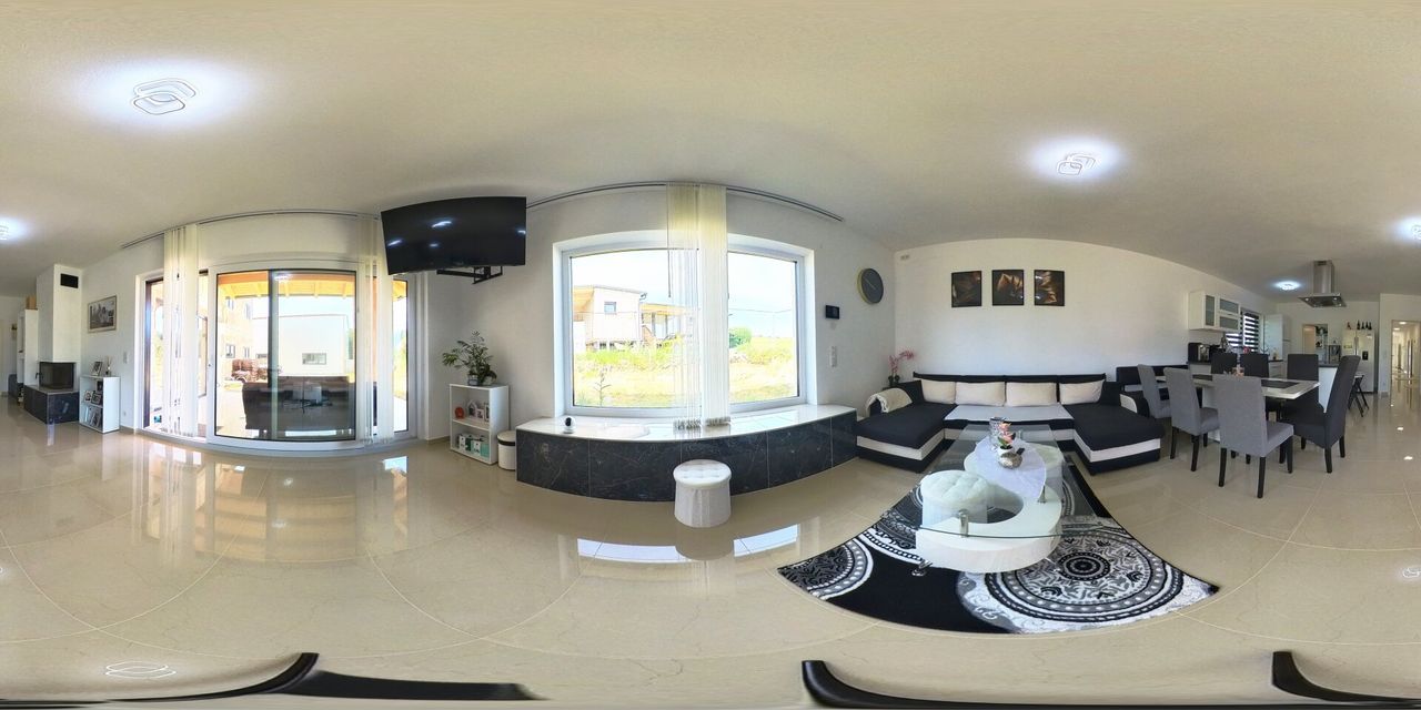 Auffällig hohe Räume und der helle Marmorboden bieten ein angenehmes Wohngefühl.