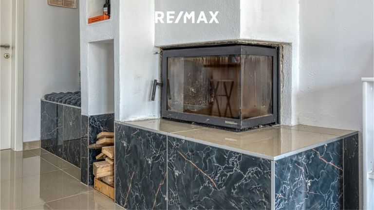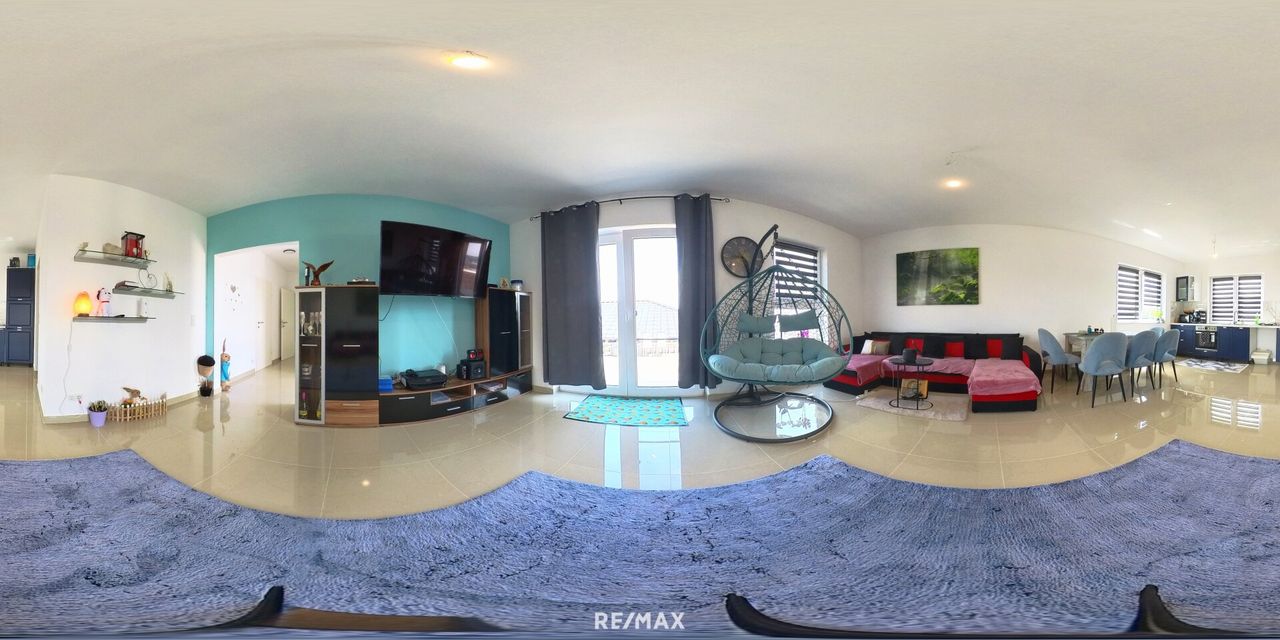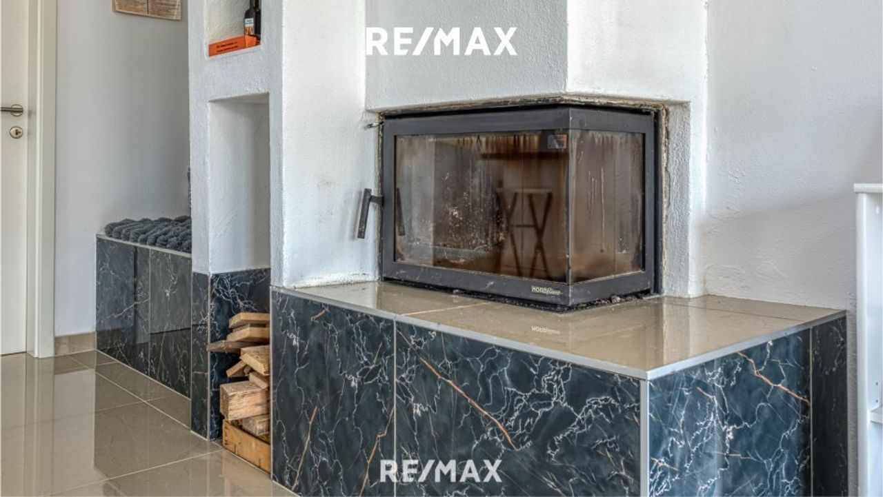 Der Wohnraum teilt sich in Vorhaus mit Garderobe, Küche mit einer Kochinsel, einer Speisekammer, sowie Essplatz und das offene Wohnzimmer mit Kamin und mit dem Ausgang auf die überdachte Terrasse.