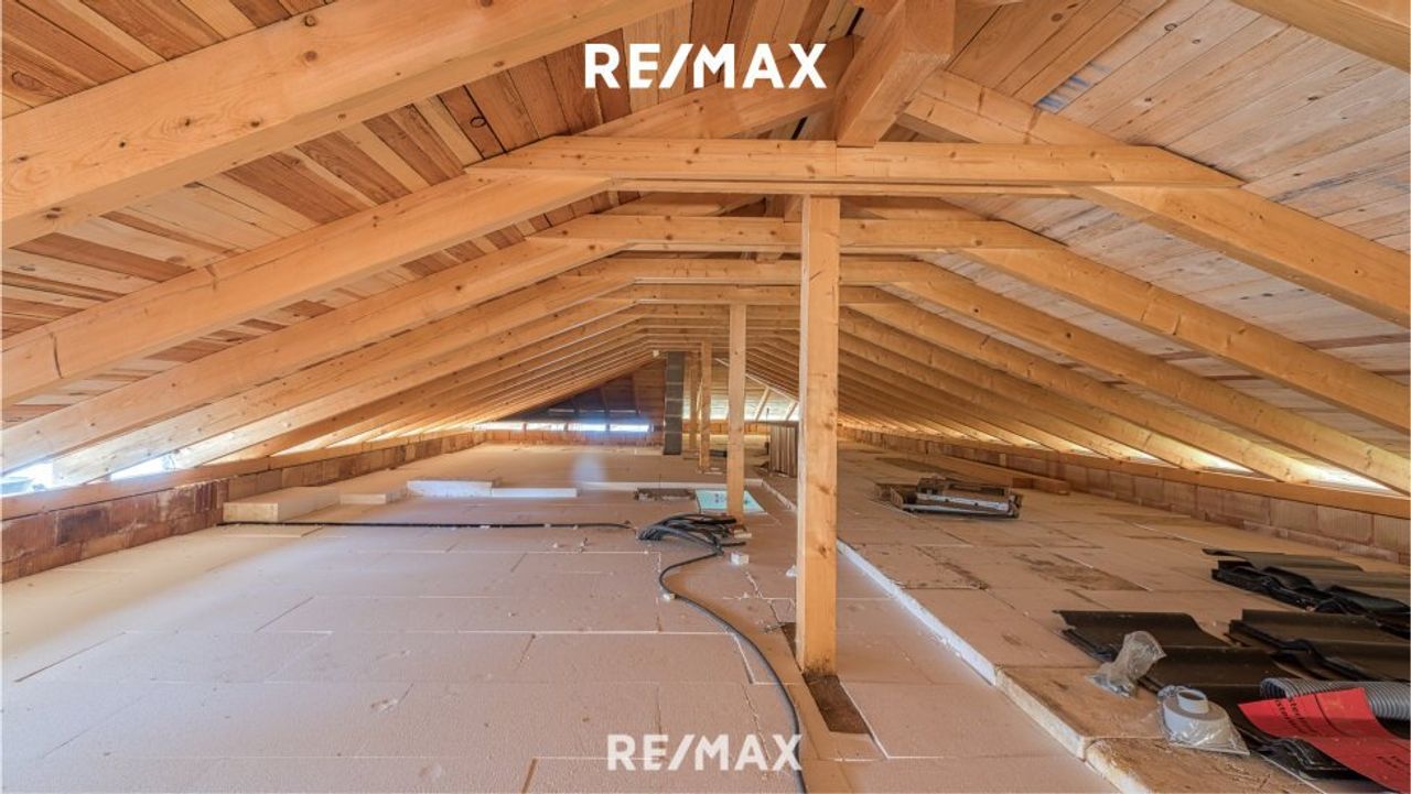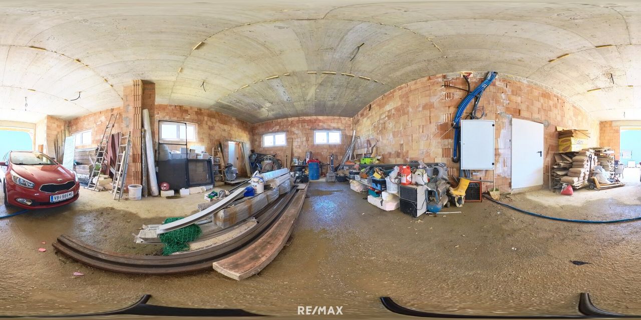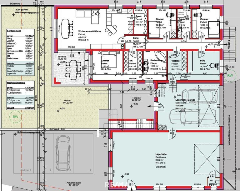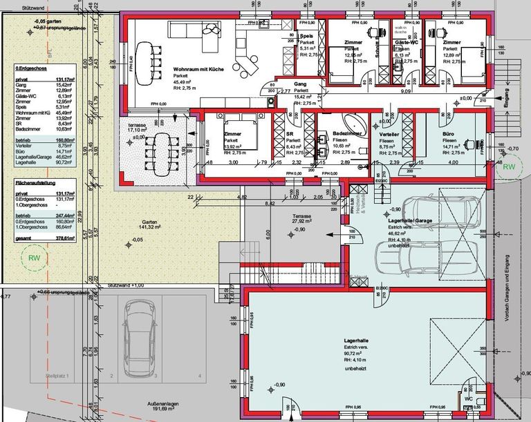 Die gesamte Nutzfläche von 378 m² teilt sich in den Wohnbereich mit 131 m², die Garagen.
