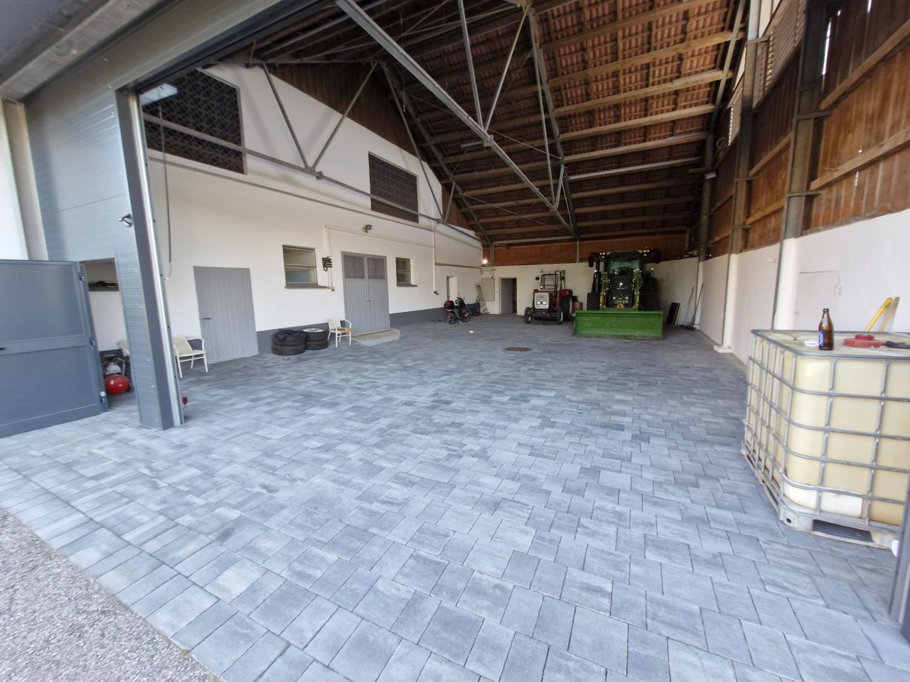 Die gesamte Halle hat einen Bodenbelag aus Pflastersteinen und ist mit einem großen Rolltor versperr bar.