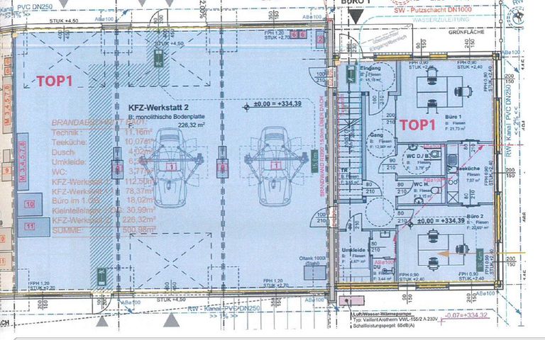 Zum Verkauf steht eine moderne Gewerbeimmobilie TOP 1 bestehend aus einer großzügigen KFZ-Werkstatt mit angrenzenden Büro- und Sozialräumen. Das Gebäude vereint Funktionalität, hochwertige Ausstattung und eine durchdachte Raumaufteilung – ideal für Handwerks-, Dienstleistungs- oder KFZ-Betriebe. Im Erdgeschoss befindet sich die große KFZ-Werkstatt mit einer Gesamtfläche von rund 226 m². Sie ist mit zwei Arbeitsplätzen, einer monolithischen Bodenplatte und allen notwendigen technischen Anschlüssen ausgestattet. Ergänzend dazu stehen Nebenräume wie Technikraum, Teeküche, Dusch- und Umkleidebereich, WC sowie ein separates Büro zur Verfügung. Die gesamte Erdgeschossfläche umfasst ca. 317m². Das Obergeschoss bietet weitere Büroflächen mit einer Gesamtgröße von rund 85m². Hier sind mehrere Büroräume, ein Archiv, eine Teeküche sowie getrennte Sanitäranlagen untergebracht. Zum Objekt gehören zudem drei KFZ-Stellplätze, die sich direkt vor dem Bürogebäude befinden. Die hellen, gut geschnittenen Räume schaffen ein angenehmes Arbeitsumfeld und eignen sich sowohl für Verwaltung, Planung als auch Kundenbetreuung. Die Immobilie überzeugt durch ihre moderne Bauweise, funktionale Struktur und flexible Nutzungsmöglichkeiten. Dank der Kombination aus Werkstatt und Büroflächen ist sie ideal für Unternehmen, die Produktion, Service und Verwaltung unter einem Dach vereinen möchten. Geheizt wird die Immobilie mittels Luftwärmepumpe.