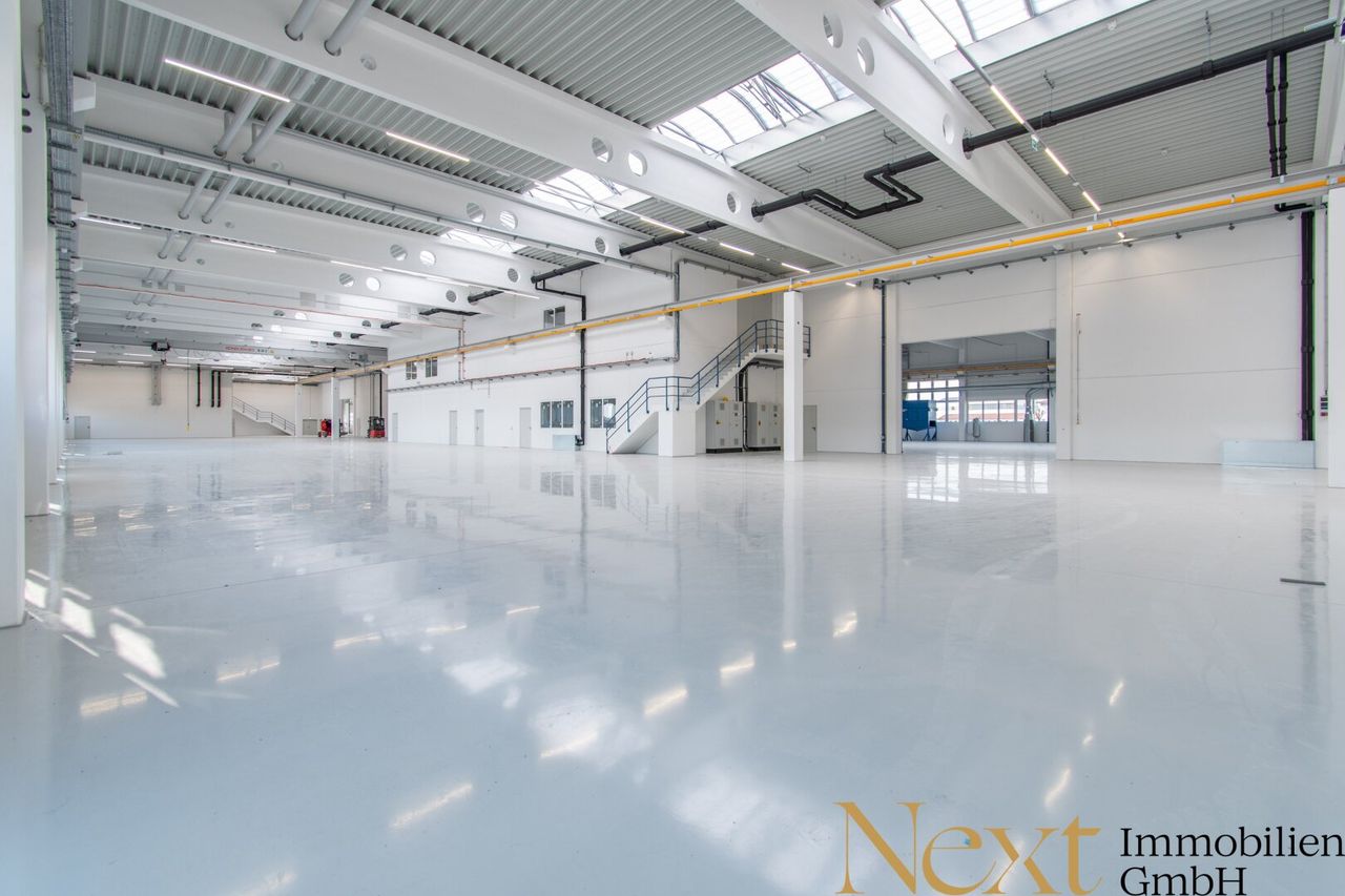 Die Halle ist für hohe statische Anforderungen ausgelegt und ermöglicht Punktlasten von bis zu ca. 150kN sowie eine zulässige Flächenlast von bis zu ca. 25kN/m². Die Lastabtragung erfolgt über Fußplatten mit einer Mindestgröße von 250 × 250mm. Zusätzlich ist die Halle mit Kranbahnträgern für Lasten bis zu 5 Tonnen ausgestattet und eignet sich somit ideal für Produktions- und Industriebetriebe...