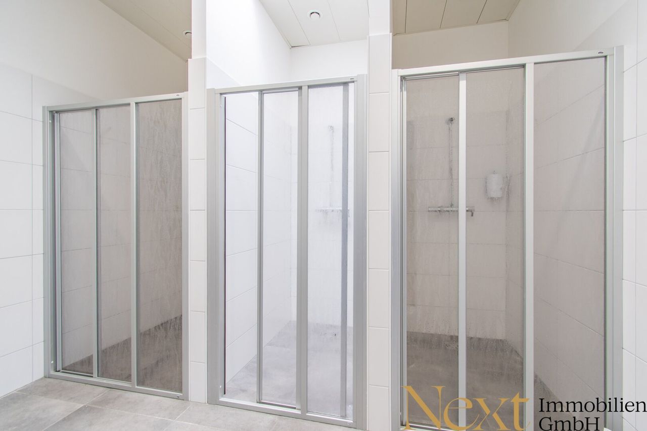 Der zweite Bürotrakt bietet im Erdgeschoss mehrere Büroräume, eine Kantine sowie zusätzliche Technik- und Sanitärbereiche. Sowohl die Büroräumlichkeiten, als auch die Kantine sind bereits vollständig möbliert und können unmittelbar bezogen werden. Im Obergeschoss befinden sich zwei großzügige Umkleideräume mit Spinden sowie zugehörige Duschanlagen mit einer bzw. drei Duschen. Ergänzend stehen in diesem Bereich weitere Sanitäranlagen zur Verfügung. Darüber hinaus befindet sich im Obergeschoss ein modernes Chefbüro mit Besprechungsbereich sowie ein zusätzlicher Abstellraum.