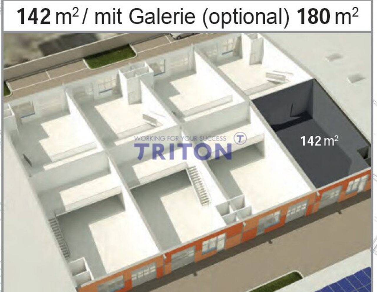 Jede einzelne Einheit umfasst 144 m² im Erdgeschoss sowie 39 m² Bürofläche auf der Galerie. Die Einheiten sind ausgestattet mit einem Eingangsportal, einem Ladetor und Sanitäranlagen inklusive Waschmöglichkeit und WC.
