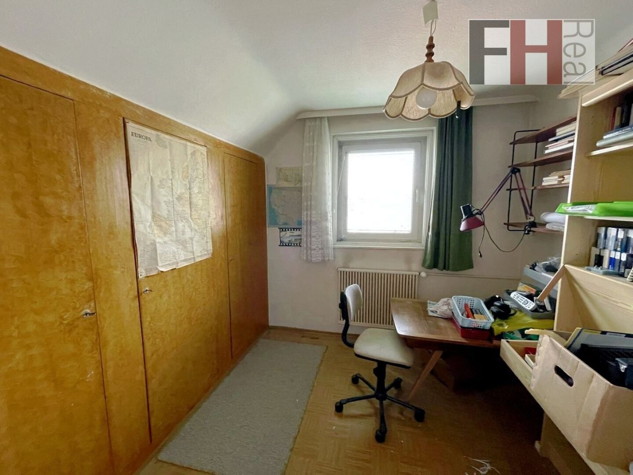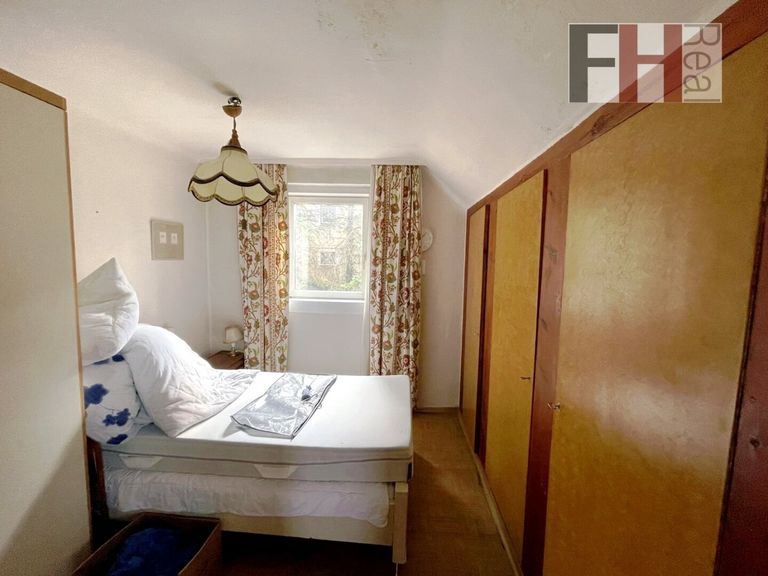Das Einfamilienhaus, ursprünglich erbaut im Jahr 1955 und in den 90iger Jahren renoviert, bietet drei Ebenen (inkl. Keller) somit insgesamt 5 Zimmer. Das Erdgeschoß betritt man über eine großzügige Diele mit separatem Gäste-WC, anschließend befindet sich neben dem Wohnzimmer und einer eigenen Küche noch ein Schlafzimmer. Von der Diele aus kommt man über eine Holztreppe in das Dachgeschoß. Dort befindet sich neben einem Badezimmer ein großer Wohnraum und zwei kleinere Kabinette. Der Keller ist über das Erdgeschoß oder auch vom Außenbereich erreichbar. In dem ca. 50m2 Kellerräumlichkeiten befindet sich der Heizraum und die Werkstatt bzw. ein etwas größerer Raum als Stauraum.