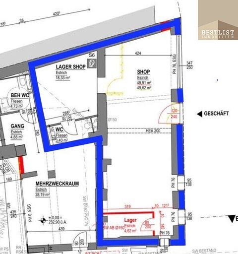 Das moderne und großzügige Geschäftslokal umfasst rund 76 m² und bietet vielfältige Nutzungsmöglichkeiten.