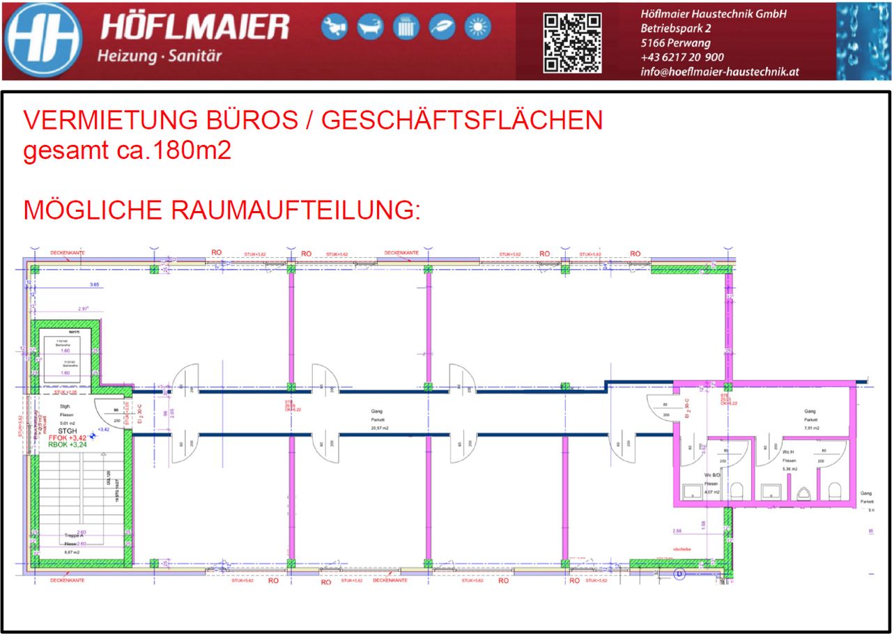 Repräsentative Büro- und Praxisfläche im Erstbezug – vielseitig nutzbar Objektbeschreibung: Diese moderne und flexibel nutzbare Geschäftsfläche mit rund 180 m² Nutzfläche (teilbar) bietet ideale Voraussetzungen für Ihr neues Büro, Ihre Kanzlei, Ihr Geschäftslokal, ein Restaurant, einen Schauraum, eine Praxis oder ein Kosmetikstudio. Die Einheit befindet sich im 1. Obergeschoss des Betriebsparks in Perwang in einer sehr gut frequentierten Lage und überzeugt durch ihre moderne technische Ausstattung sowie die Möglichkeit, die Raumaufteilung individuell nach Ihren Bedürfnissen zu gestalten. Derzeit befindet sich das Objekt im Edelrohbau-Zustand, sodass Ihre persönlichen Wünsche noch berücksichtigt werden können. Ausstattung & Highlights: • Eigener, repräsentativer Eingang •...