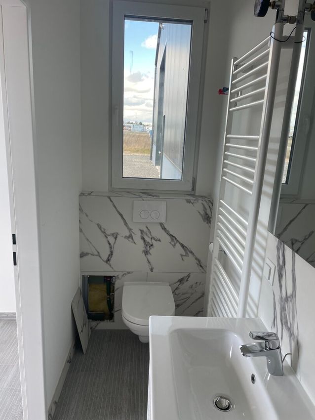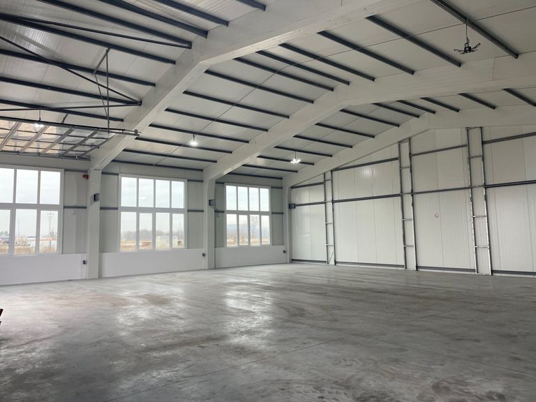 Vermietet wird eine erstklassig ausgestattete, helle Hallenhälfte mit ca. 360m² Hallenfläche, Empfang und WC (11m²). BJ 2024/25