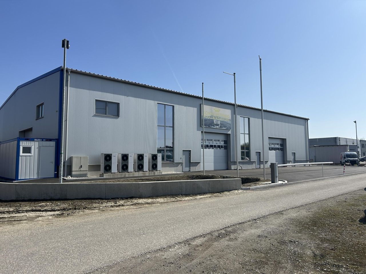 Die Halle wird mit einer Luftwärmepumpe beheizt und hat auch eine Fussbodenheizung .