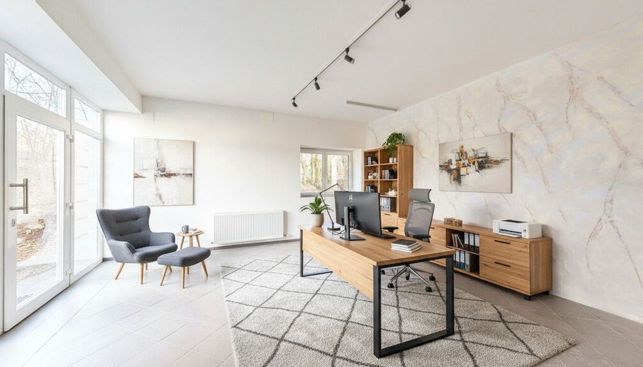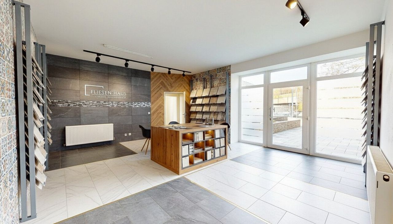 Erdgeschoss (ca. 133,3 m²): Repräsentativ & Funktional Der Zugang erfolgt direkt von der Villacher Straße. Sie betreten ein lichtdurchflutetes Büro, das mit modernen, dunklen Fliesen ausgestattet ist. Die großzügigen Fensterfronten sorgen nicht nur für eine angenehme Arbeitsatmosphäre, sondern bieten auch exzellente Sichtbarkeit für Ihr Unternehmen.