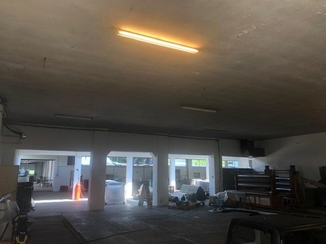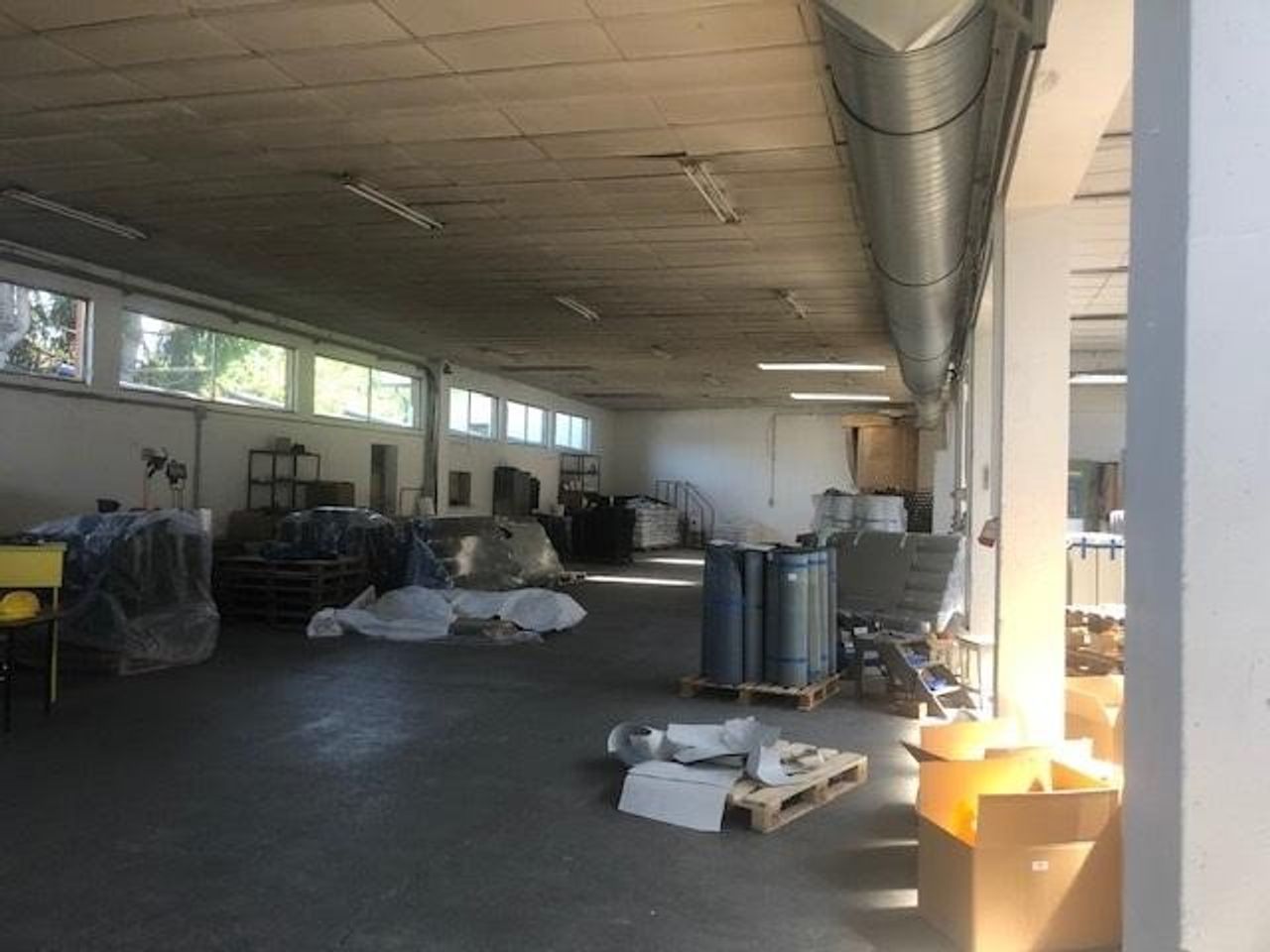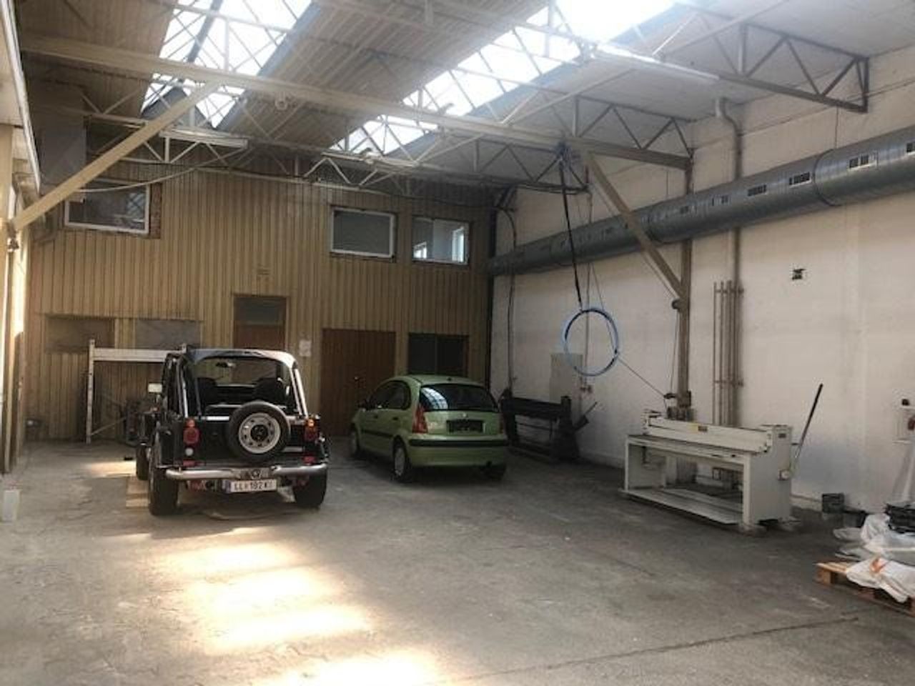 Eine Halle mit mehreren Schiffen aber durchgängig mit MB Widmung. Höhe zwischen 4,50 und 6 Meter. Es gibt auch eine kleine Werkstatt in der Halle, Aufenthaltsräume und Toiletten. Die linke Halle wurde vor 5 Jahren gebaut.