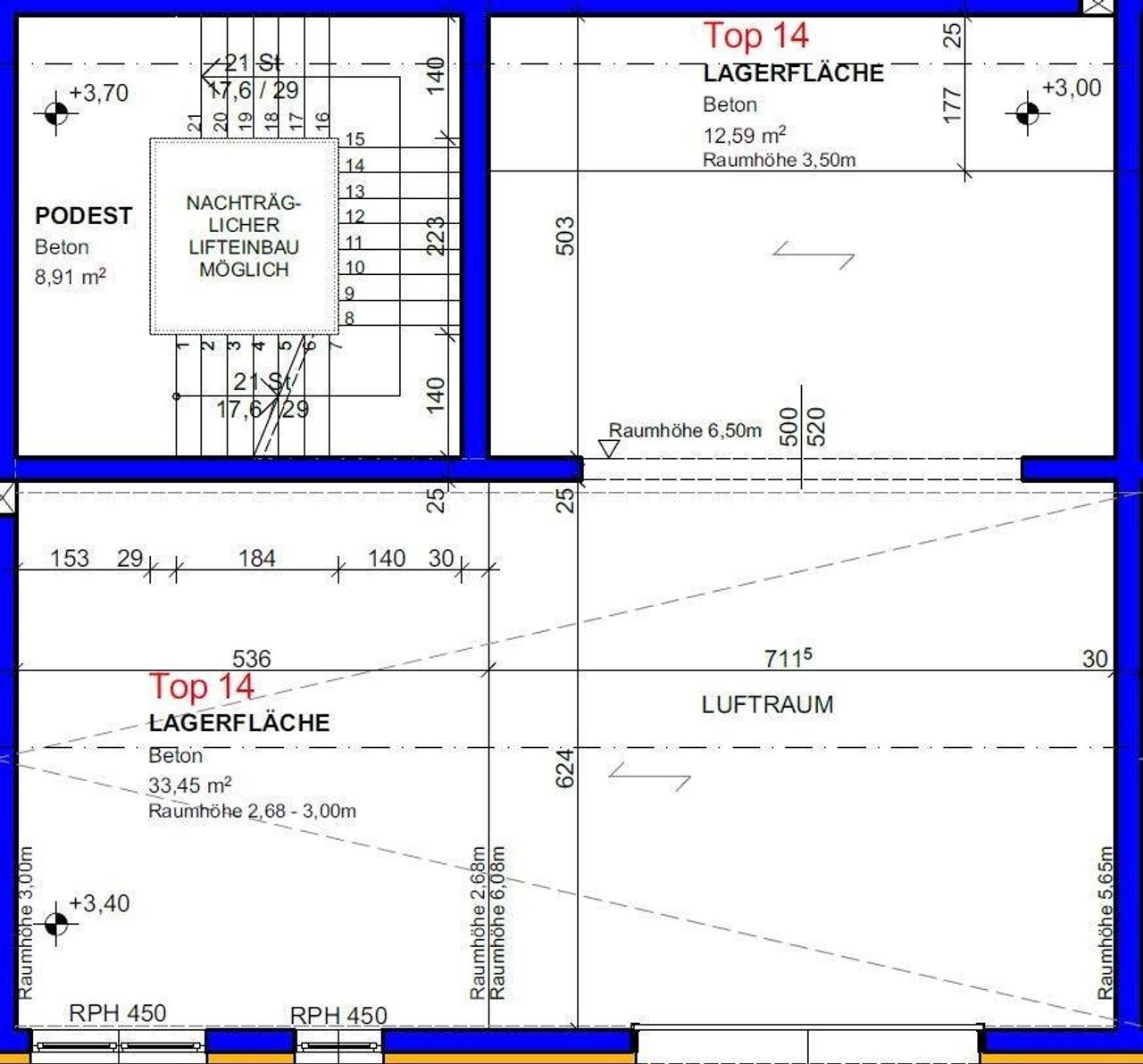 - Schaffung zusätzlicher Flächen (Büro) durch Einbau einer Zwischenebene möglich