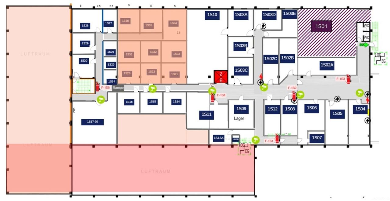 Der Raum überzeugt durch seine großzügige, offene Fläche sowie durch mehrere Fenster, die für viel Tageslicht sorgen und eine angenehme Arbeits- bzw. Präsentationsatmosphäre schaffen.