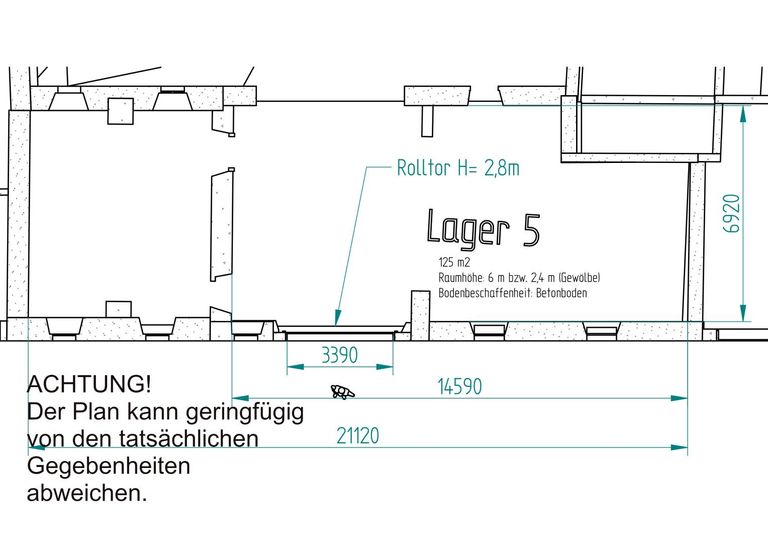 Das Lager mit der Nummer 5 ist ca. 125m² groß. Insgesamt kann eine Lagerfläche von ca. 700m² angemietet werden.