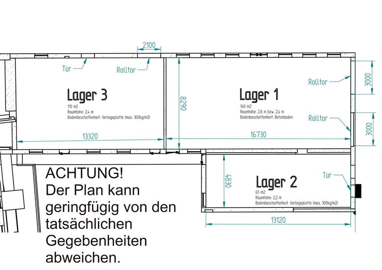 Das Lager mit der Nummer 1 ist ca. 135 m² groß, das Lager mit der Nummer 2 hat eine Fläche von ca. 60 m², das Lager mit der Nummer 3 hat eine Fläche von ca. 105m² .