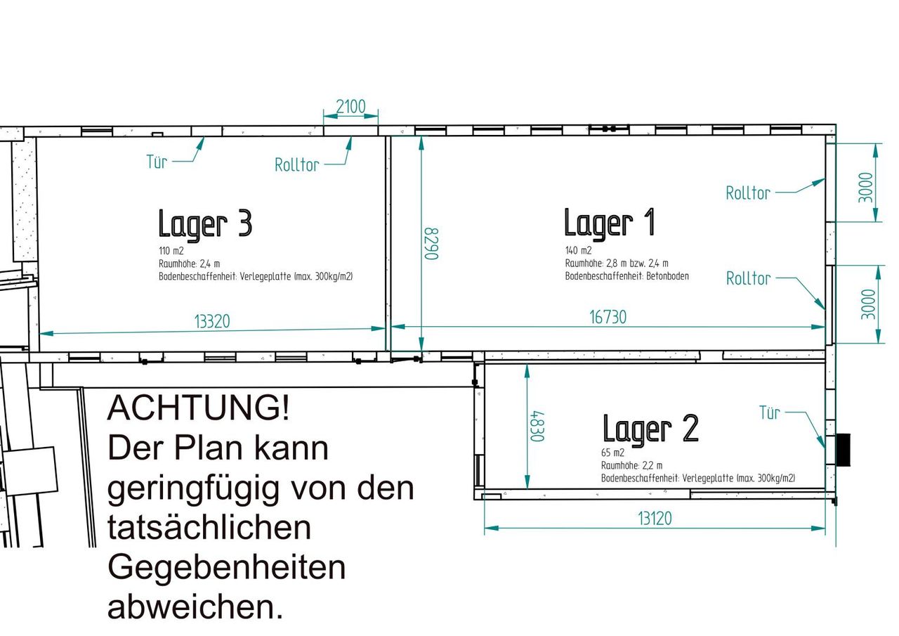 Das Lager mit der Nummer 1 ist ca. 135 m² groß, das Lager mit der Nummer 2 hat eine Fläche von ca. 60 m², das Lager mit der Nummer 3 hat eine Fläche von ca. 105m² .