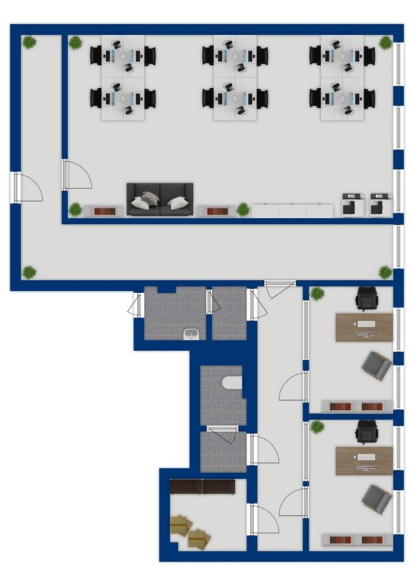 - Zwei zusätzliche, separat begehbare Räume – ideal als Einzelbüros, Beratungsräume oder Rückzugszonen