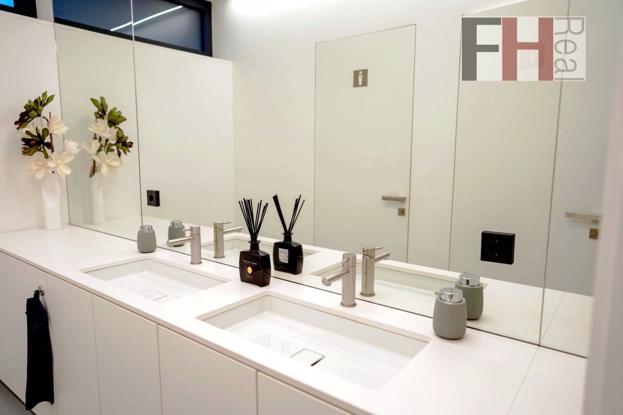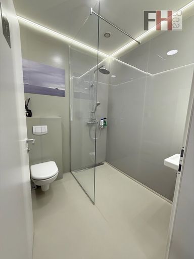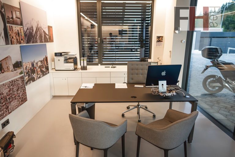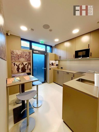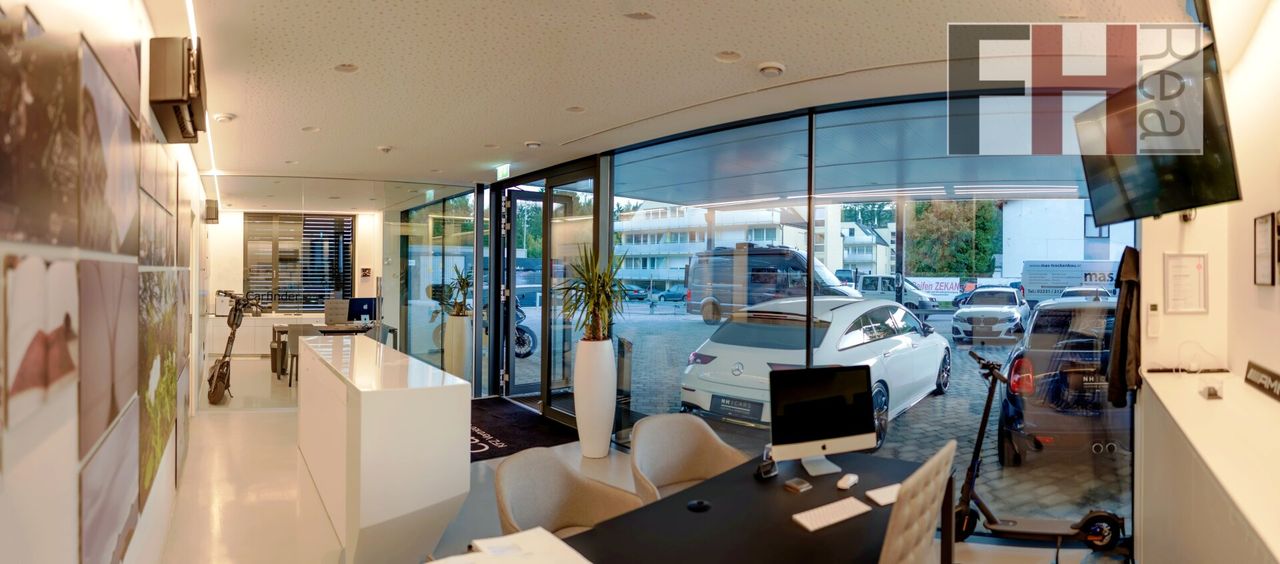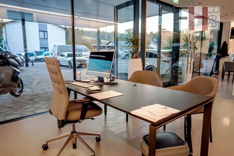 Die modernen, klimatisierten Büroräumlichkeiten mit vielen Glasflächen und mit Blick auf den Außenbereich sind in 2 Büros, einen Kundenaufenthaltsraum mit kleiner Küchenausstattung und hochwertig ausgestatteten Toiletten gegliedert.