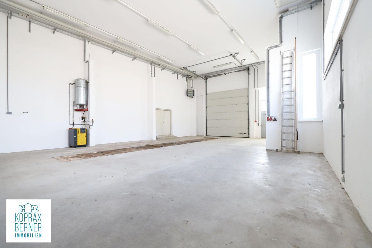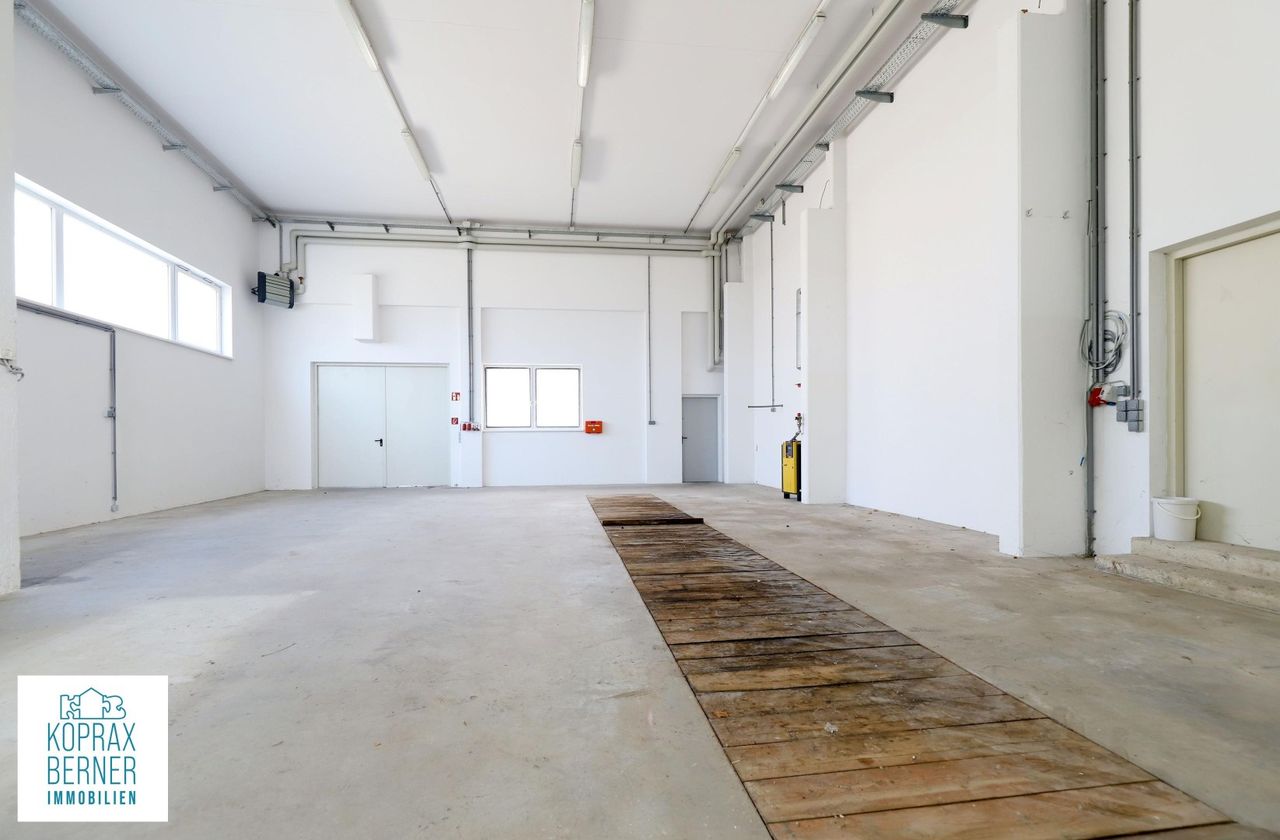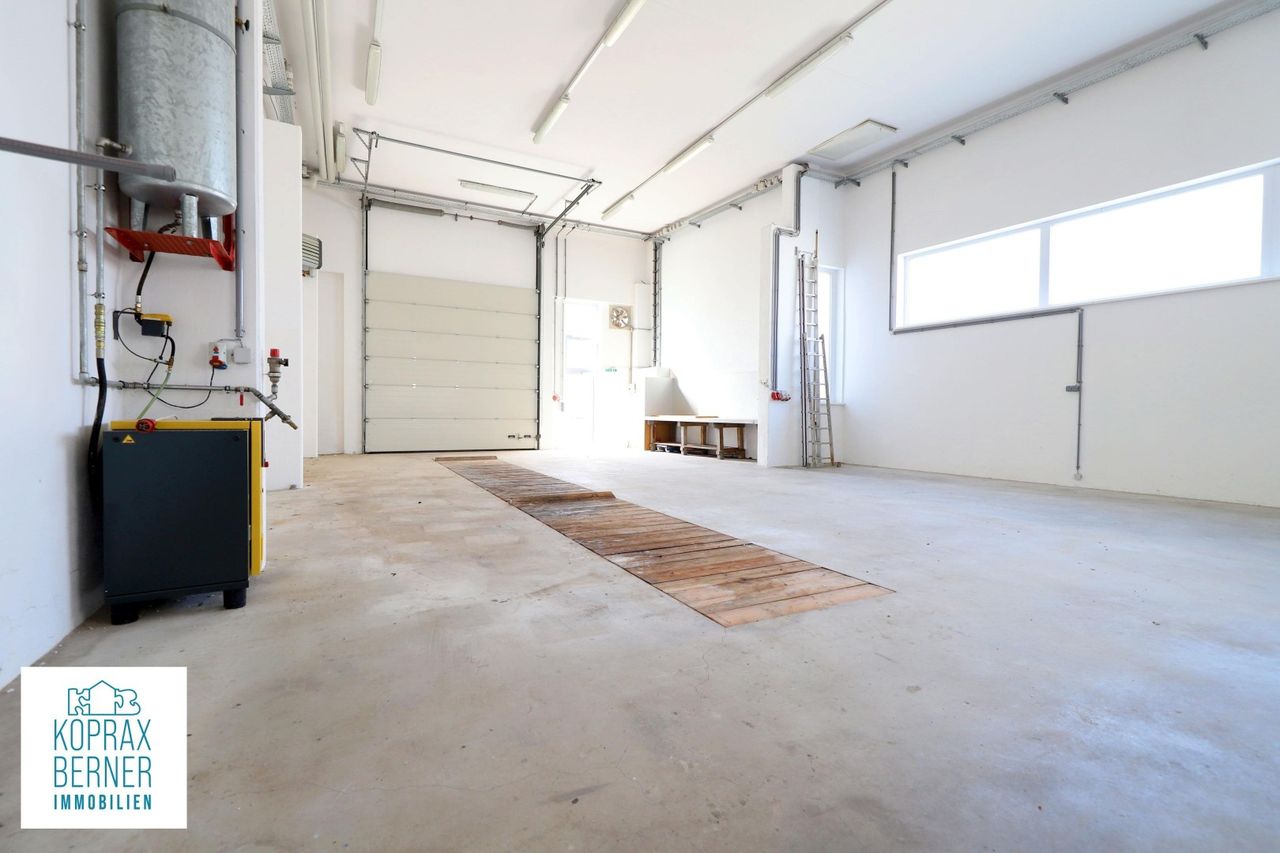 Beheizbare Halle/Betriebsgebäude Diese moderne Halle liegt in zetraler Lage in der Gemeinde Pyhra bei St.Pölten und hat ein vielfältiges Nutzungspotetial. Durch die Beheizbarkeit, eigent sie sich nicht nur zum Lagern, sondern kann auch als Betriebsstandort genutzt werden. Neben dem großen Hallenraum steht auch noch ein weiterer Arbeitsraum zur Verfügung, der auch mit einem Wasseranschluss ausgestattet ist. Die Halle verfügt über ein großes hohes Rolltor und Gehtüre, sowie über ein 2-flügeliges Tor auf der gegenüber liegenden Seite. Es wurde eine mit Holz abgedeckte Montagegrube eingebaut und sie ist ebenfalls mit Starkstrom und Druckluft ausgestattet. Es besteht auf Grund der baulichen Konstruktion...