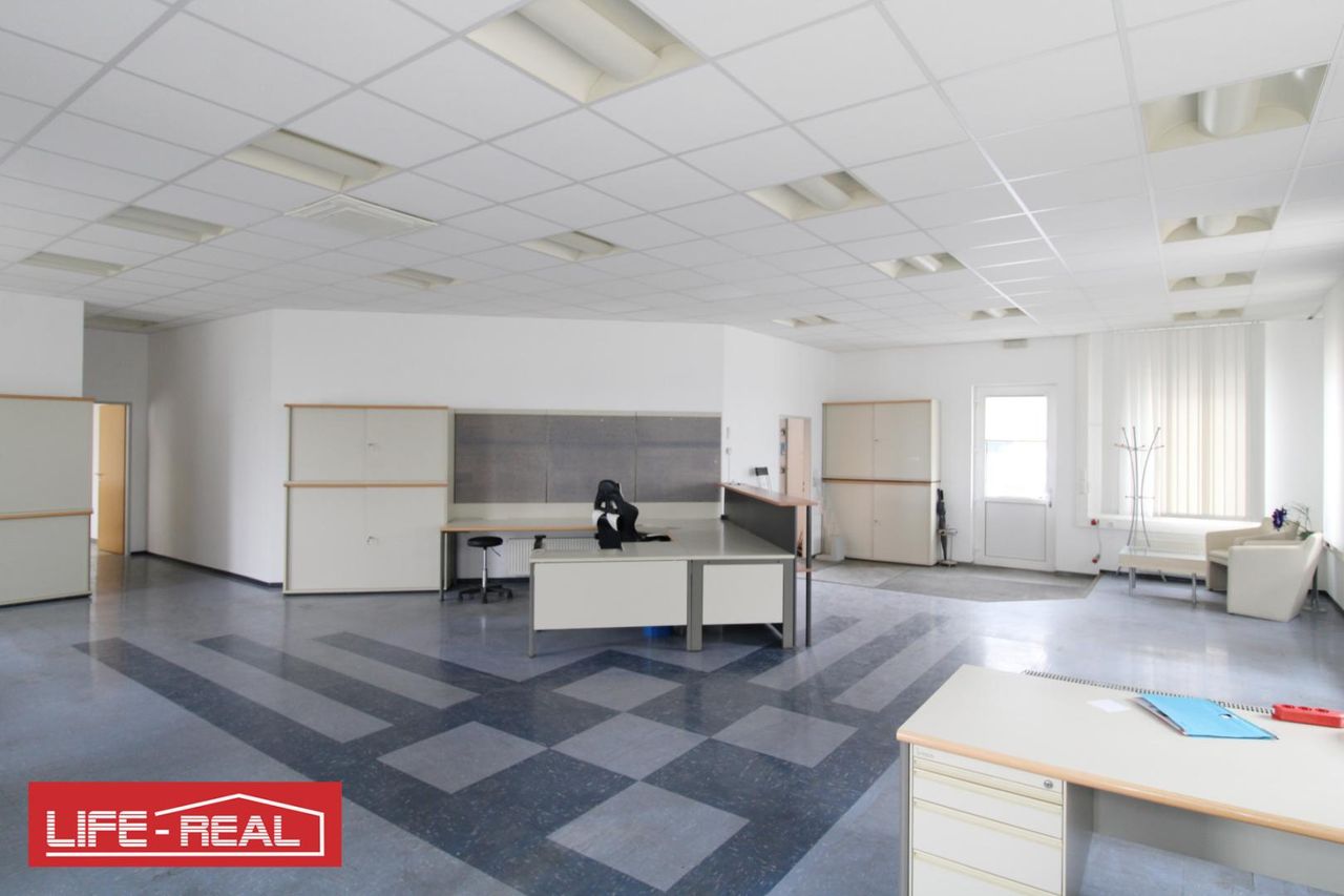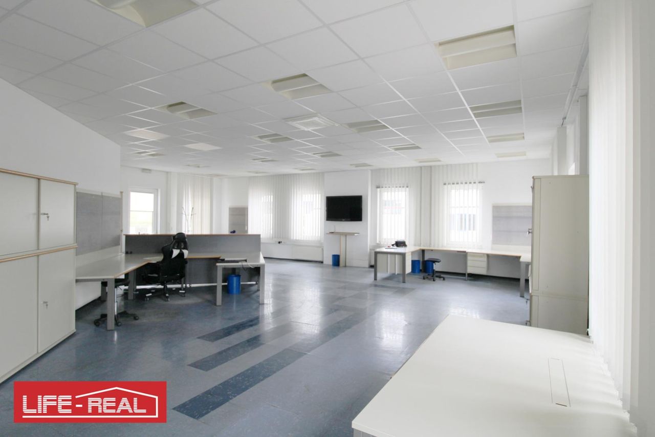 Der Bürobereich ist über einen separaten Eingang zugänglich und bietet ausreichend Platz für mehrere Arbeitsplätze oder einen Kundenempfang. Zusätzlich steht eine kleine Küche mit Pausenbereich für Mitarbeiter zur Verfügung.
