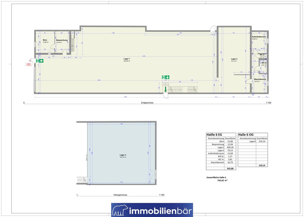 Zusätzliche Flächen: – Lager 2: ca. 79 m² – Büro: ca. 16 m² – Besprechungsraum: ca. 12 m² – Waschbereich: ca. 17 m² – Aufenthaltsraum: ca. 13 m² – WC (Herren): ca. 3,8 m² – WC (Damen): ca. 1,3 m²