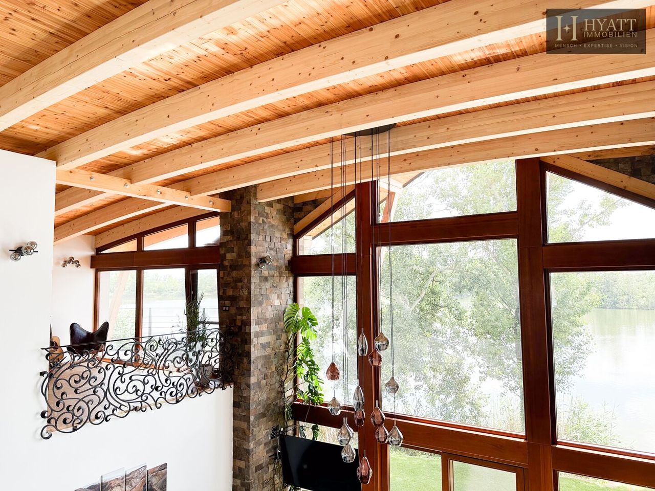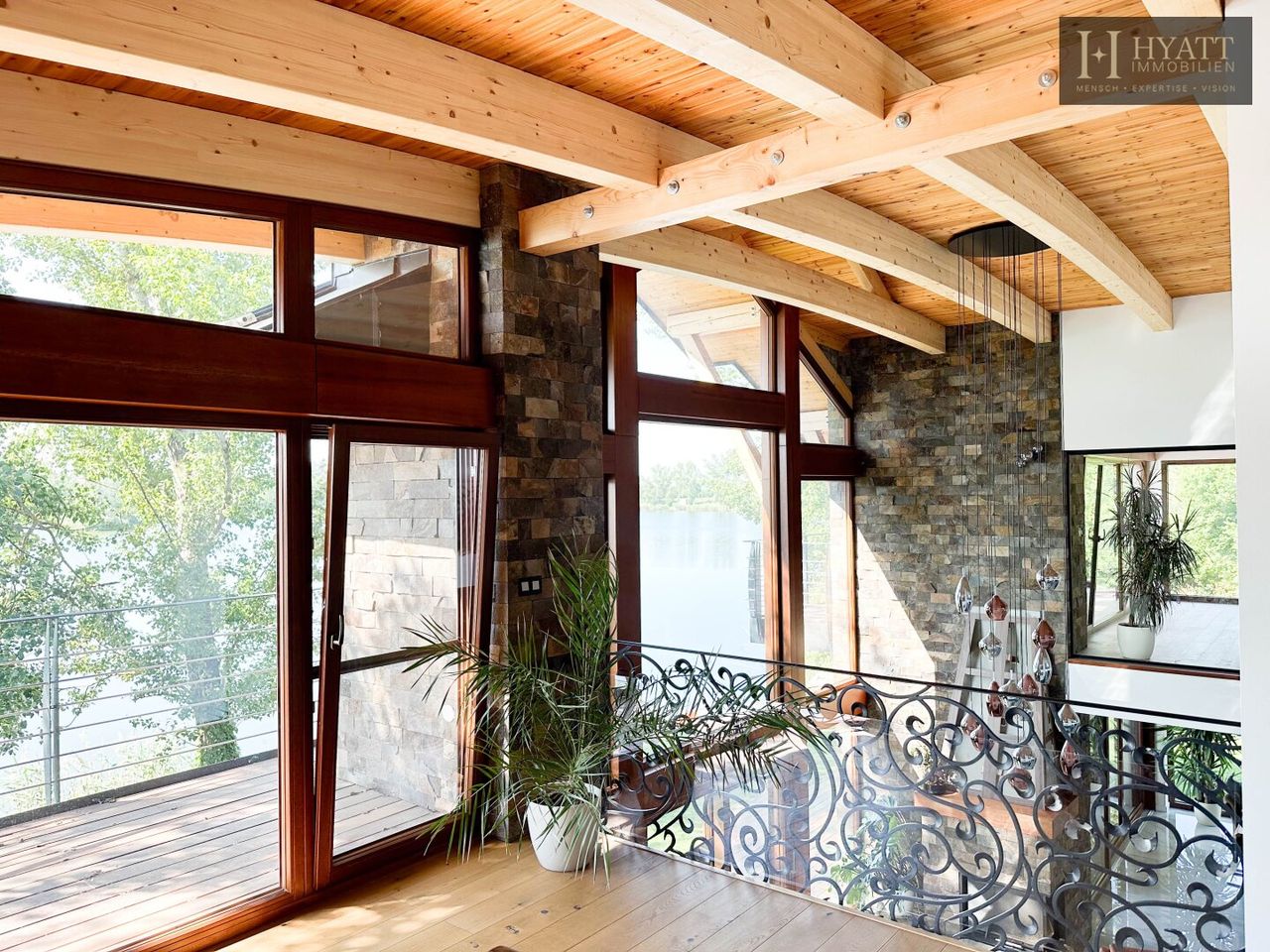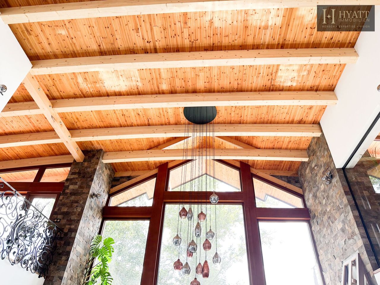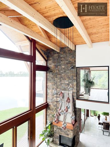 Das architektonische Highlight bildet die beeindruckende Dachkonstruktion aus großzügigen Holzspannbögen mit edler Zedernholzverkleidung, die für ein angenehmes Raumklima sowie optimalen Lichteinfall sorgt. Hochwertige Materialien wie exotische Hölzer, großformatige Fliesen und edle Natursteine unterstreichen den luxuriösen Charakter der Immobilie.