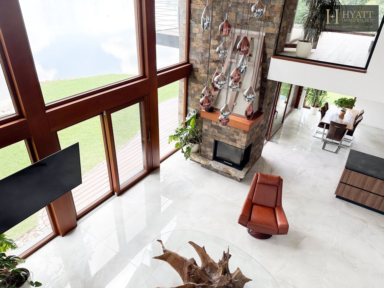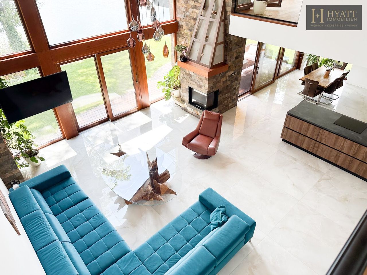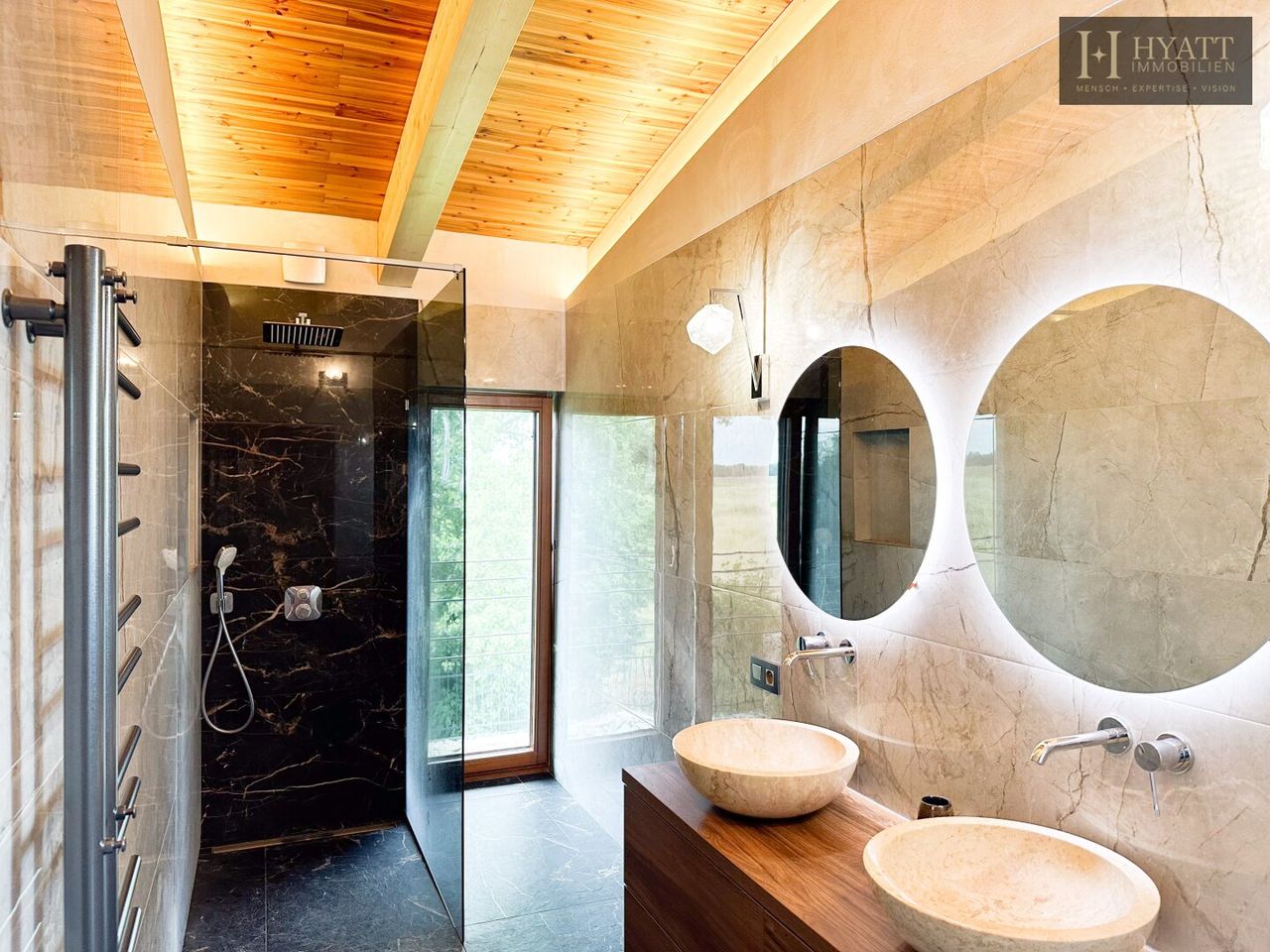 Das architektonische Highlight bildet die beeindruckende Dachkonstruktion aus großzügigen Holzspannbögen mit edler Zedernholzverkleidung, die für ein angenehmes Raumklima sowie optimalen Lichteinfall sorgt. Hochwertige Materialien wie exotische Hölzer, großformatige Fliesen und edle Natursteine unterstreichen den luxuriösen Charakter der Immobilie.
