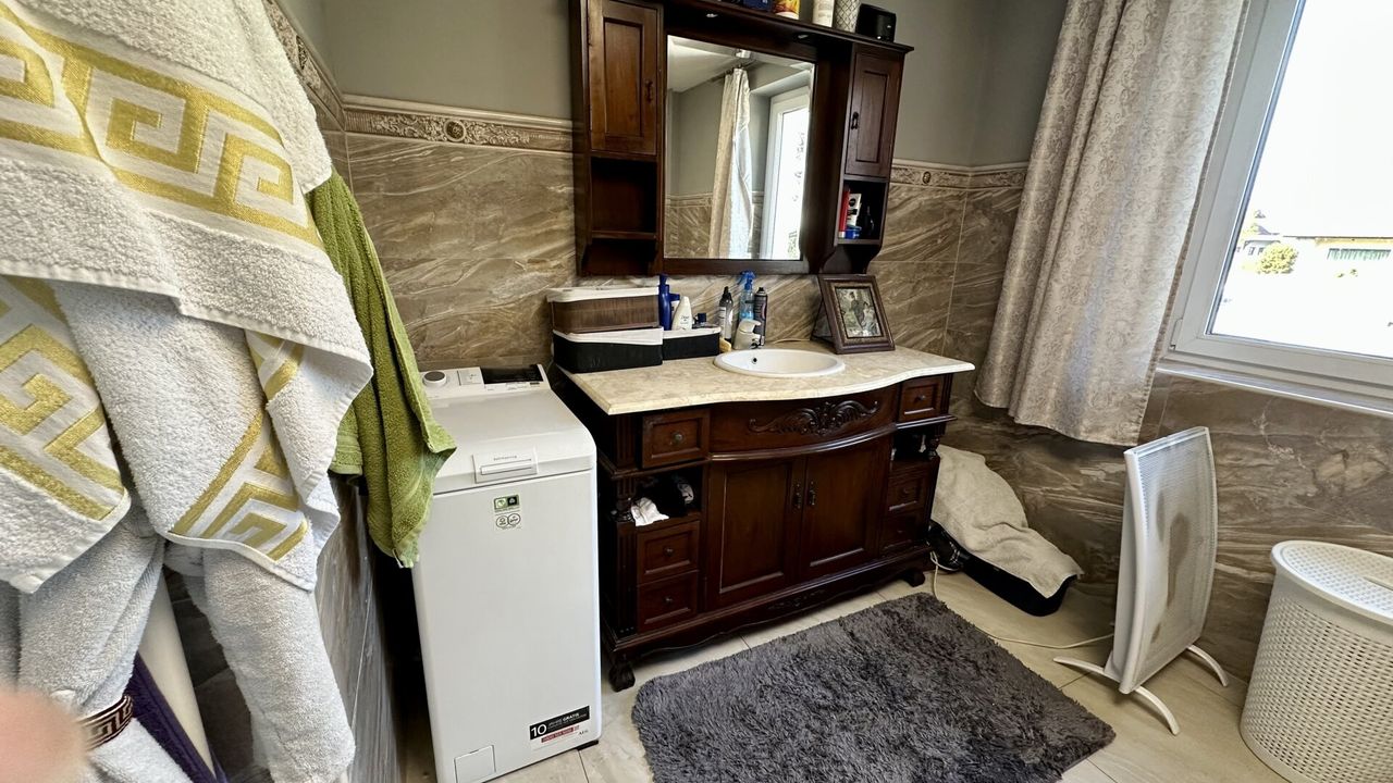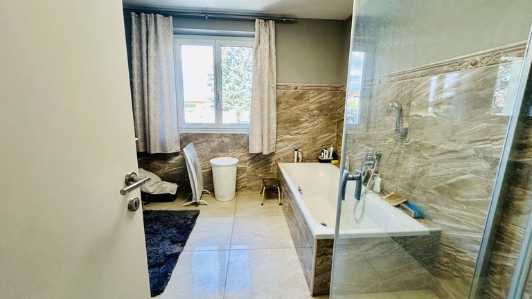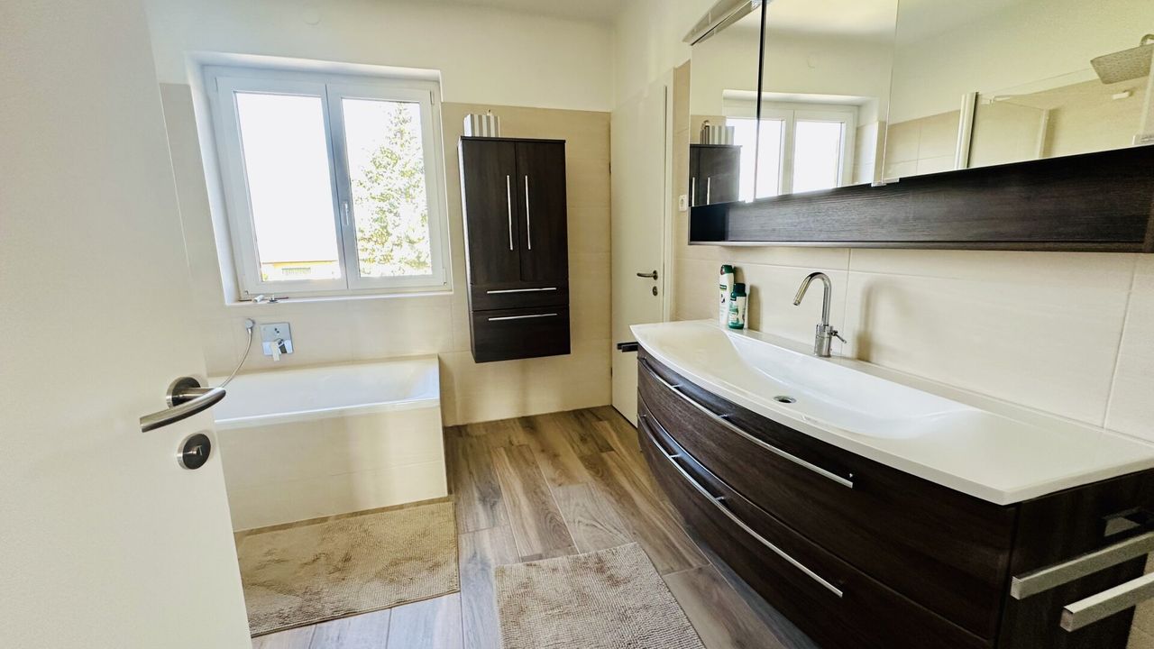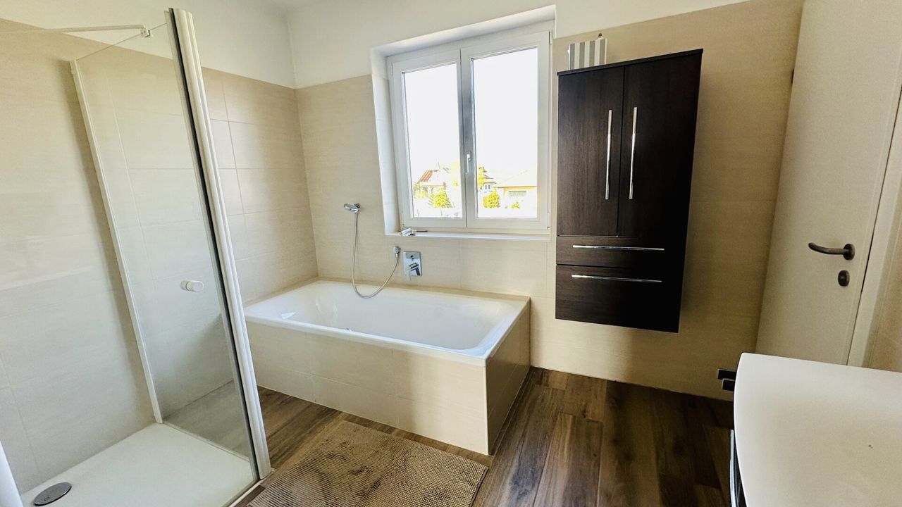 Zwei moderne Bäder, davon eines mit Fenster und Badewanne, sowie zwei separate WCs gewährleisten hohen Komfort für die ganze Familie. Die zentrale Gasheizung sorgt für effiziente und gleichmäßige Wärmeverteilung im gesamten Haus.