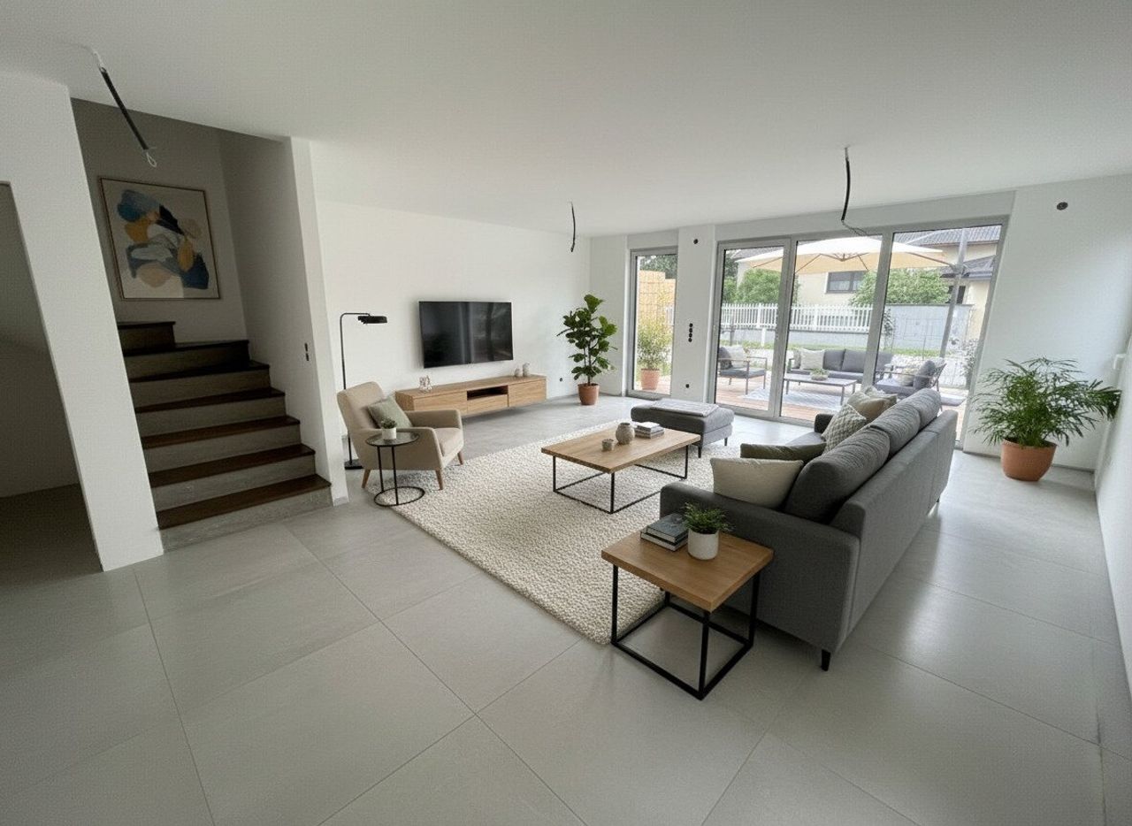 „Die dargestellten Möbel und Einrichtungsgegenstände dienen der besseren räumlichen Vorstellung und wurden mittels KI visualisiert. Sie sind nicht Bestandteil der tatsächlichen Ausstattung der Immobilie.“