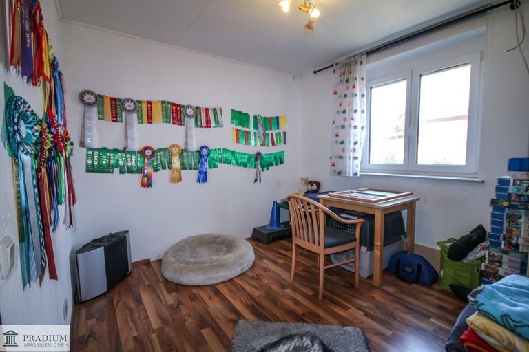 Im Erdgeschoss befinden sich zwei separat zugängliche Zimmer, sowie ein erst kürzlich saniertes Badezimmer. Über den Flur erreicht man eine Reihe von Nebenräumen, die genügend Platz für Hobbybastler bieten und auch als Lagerraum genutzt werden können – diese Räume sind quasi ein Ersatz für einen Keller. Im Obergeschoss befinden sich drei separate Zimmer sowie das Badezimmer.