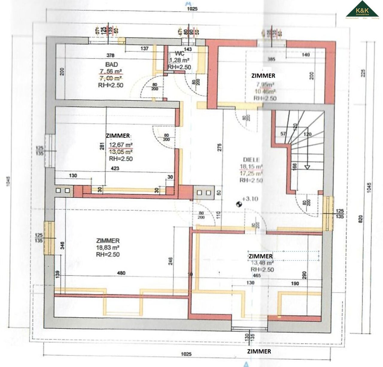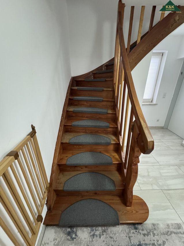 Über die Stiege der Diele gelangt man ins Dachgeschoss (fast keine Dachschrägen, nur bei den beiden straßenseitigen Zimmern).