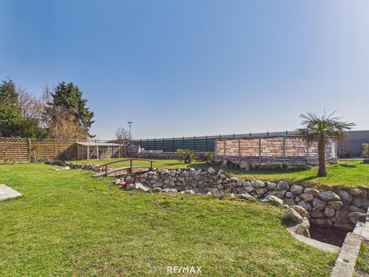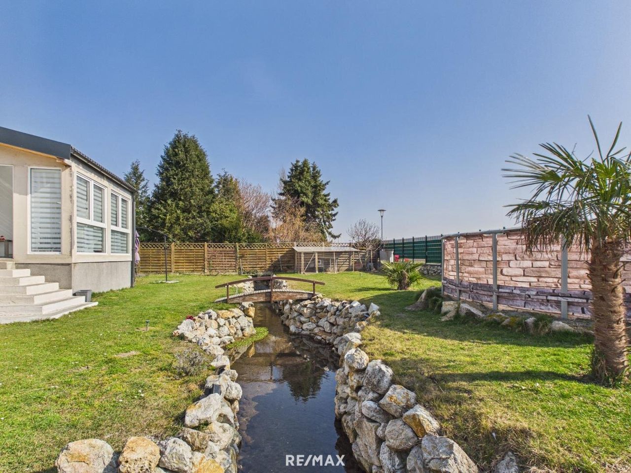 Der liebevoll angelegte Bachlauf, der sich durch den Garten zieht, verleiht dem Außenbereich eine außergewöhnliche Atmosphäre. Natursteine, Grünflächen und eine kleine Brücke schaffen ein harmonisches Gesamtbild und machen diesen Garten zu einer echten Wohlfühloase.