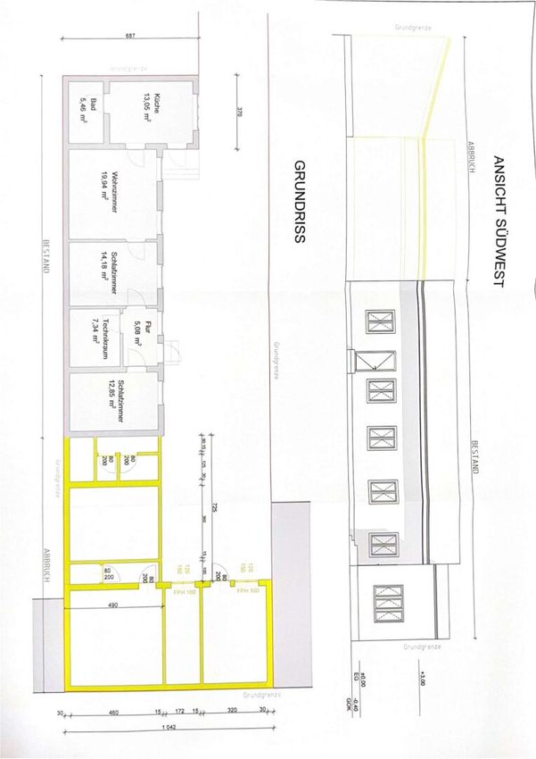 - Vorraum, Küche, 2 Schlafzimmer, Wohnzimmer, Badezimmer mit Dusche und WC, Abstellraum/Technikraum mit Waschmaschinenanschluss und Aufgang in den Dachboden (insgesamt 2 Hauseingänge)