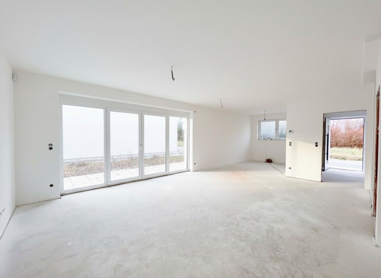 - eine 38,38 m2 große Wohnküche mit Ausgang zur 18 m2 Terrasse und zum Garten