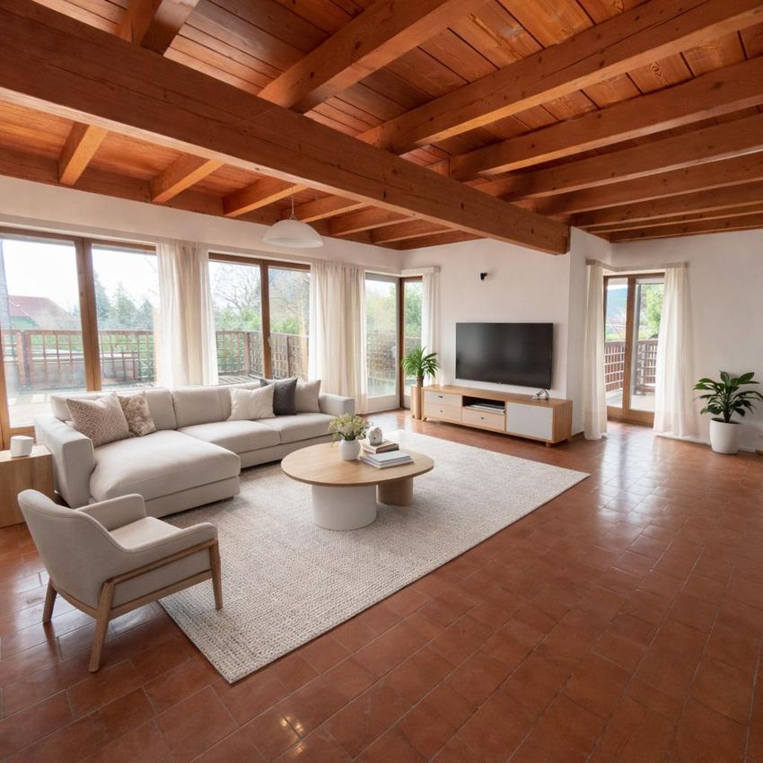 Der großzügige Wohn- und Essbereich bildet das Herzstück der Villa und bietet direkten Zugang zur Terrasse und zum Garten. Große Fensterflächen sorgen für viel Tageslicht und schaffen eine angenehme Wohnatmosphäre.