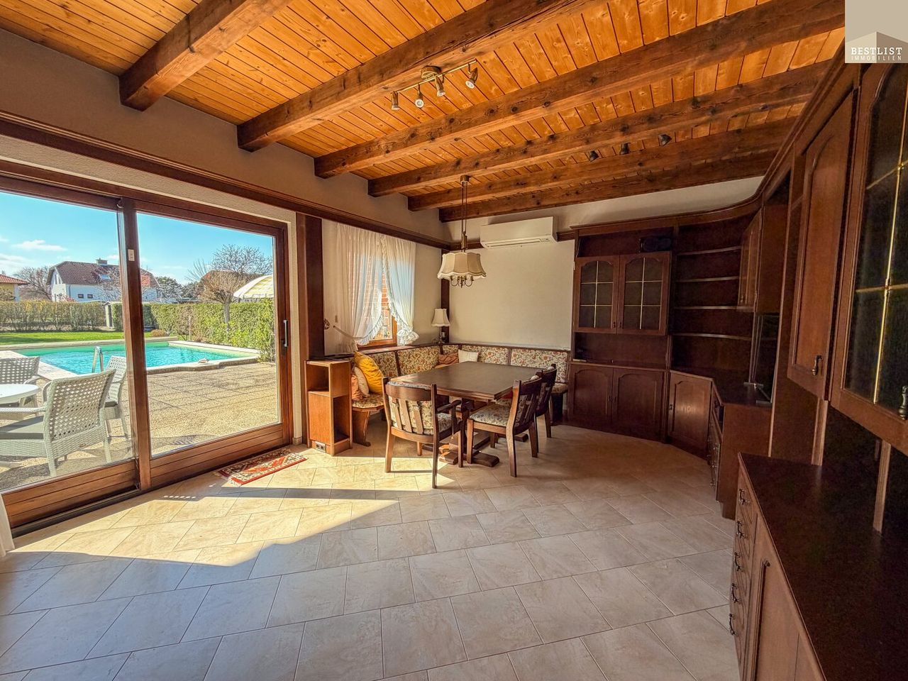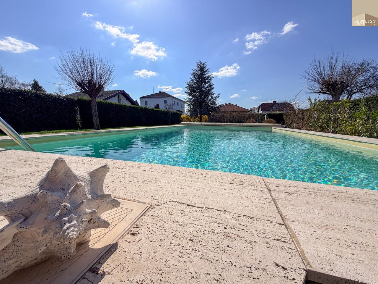 Das Grundstück selbst stellt einen wesentlichen Mehrwert dar. Mit rund 1.089 m² eröffnet sich hier ein Höchstmaß an Privatsphäre und Gestaltungsfreiheit. Der beheizte Pool mit Gegenstromanlage bietet sowohl Erholung als auch sportliche Nutzung, während die sonnige Terrasse mit Grillkamin einen idealen Rahmen für entspannte Abende schafft.