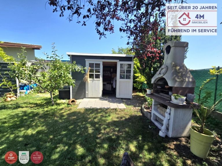 - Gartenhaus und gepflegter Garten mit Obstbaumbestand