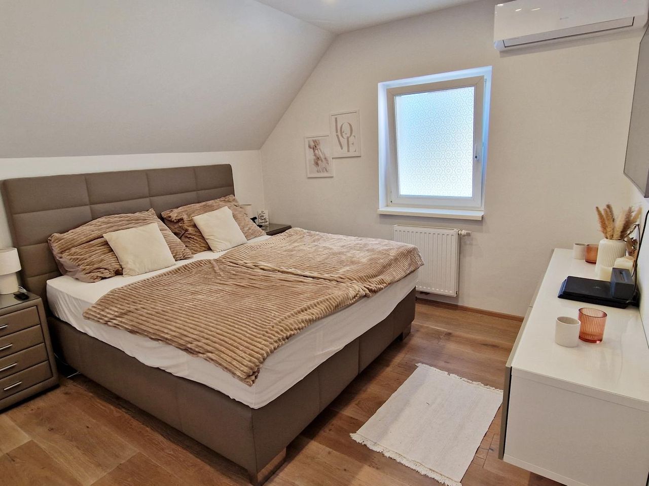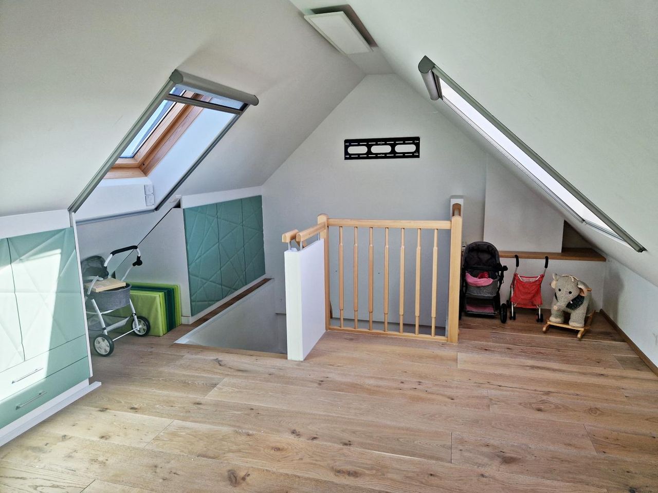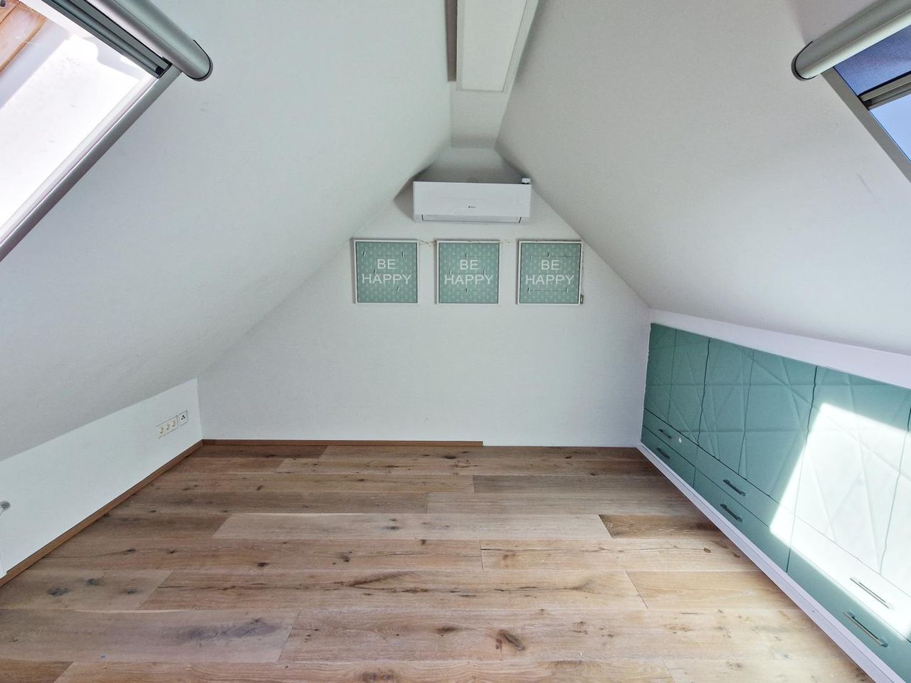 Das Elternschlafzimmer verfügt über einen begehbaren Kleiderschrank, das Badezimmer über eine großzügige Dusche. Alle Schlafräume und der zusätzliche Raum im Dachgeschoss sind mit Klimaanlage ausgestattet.