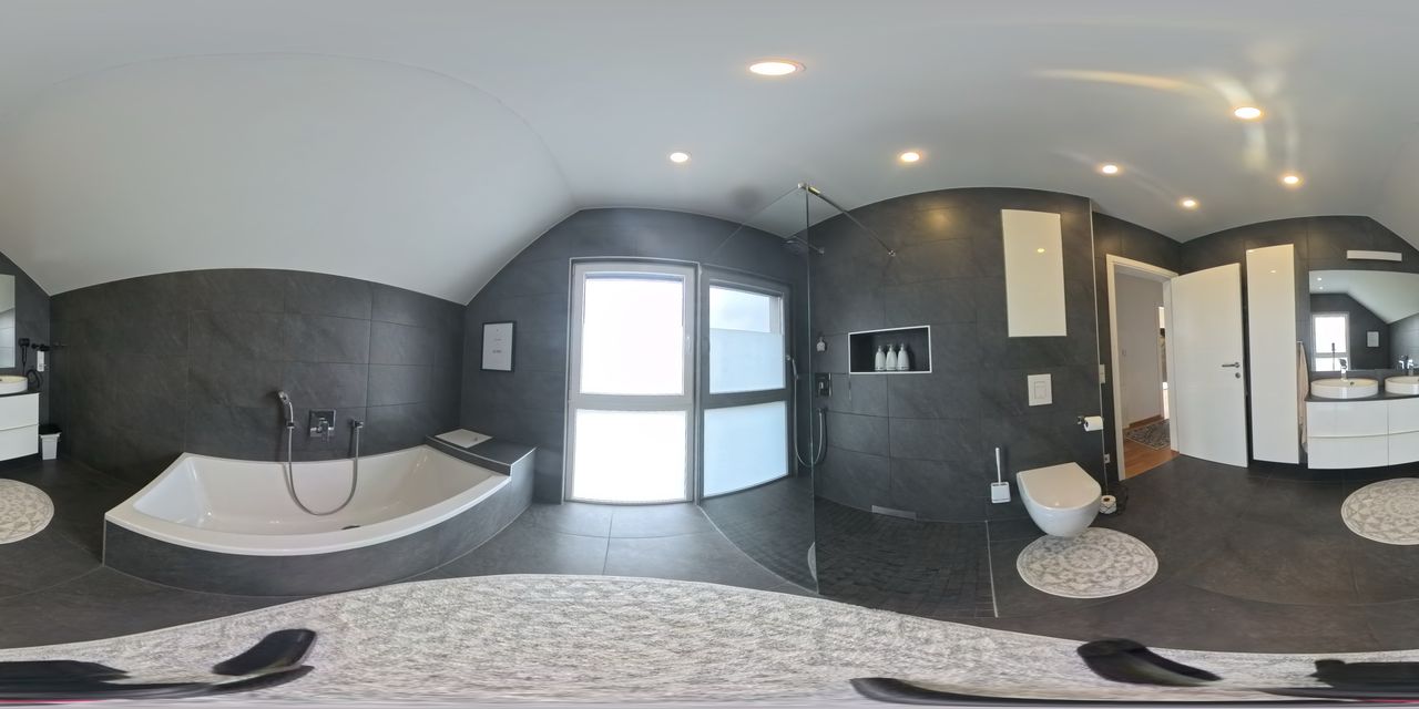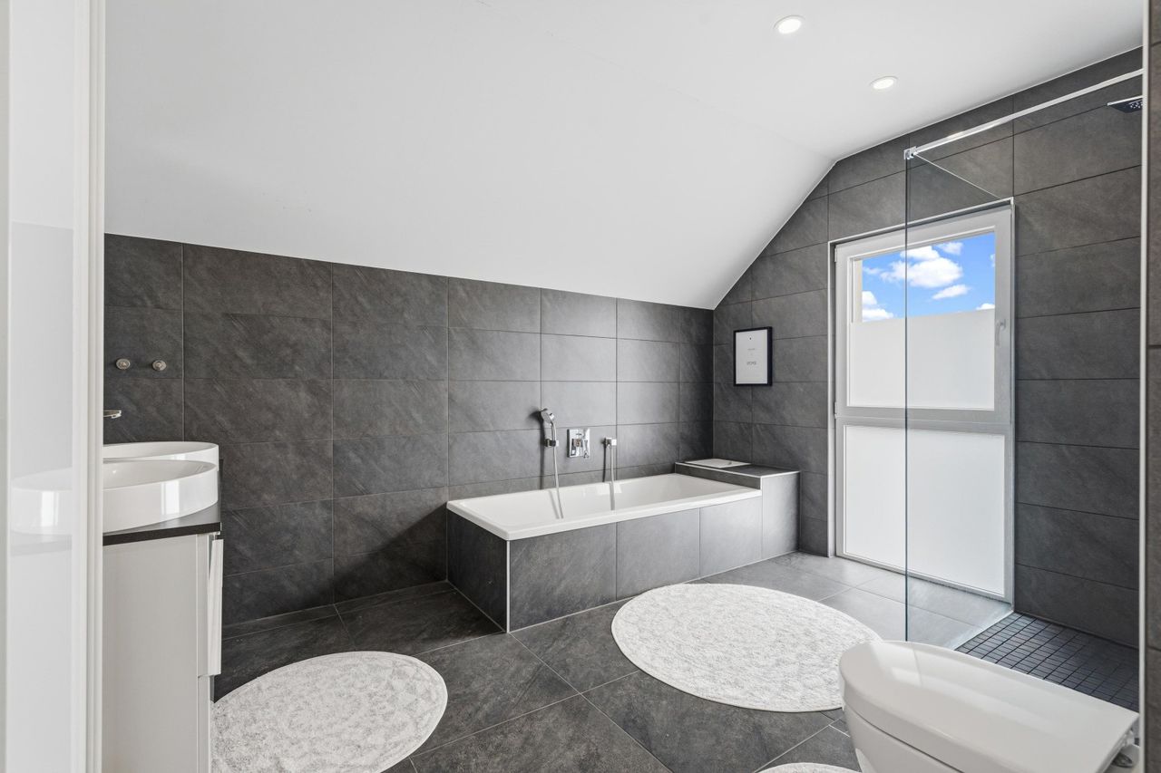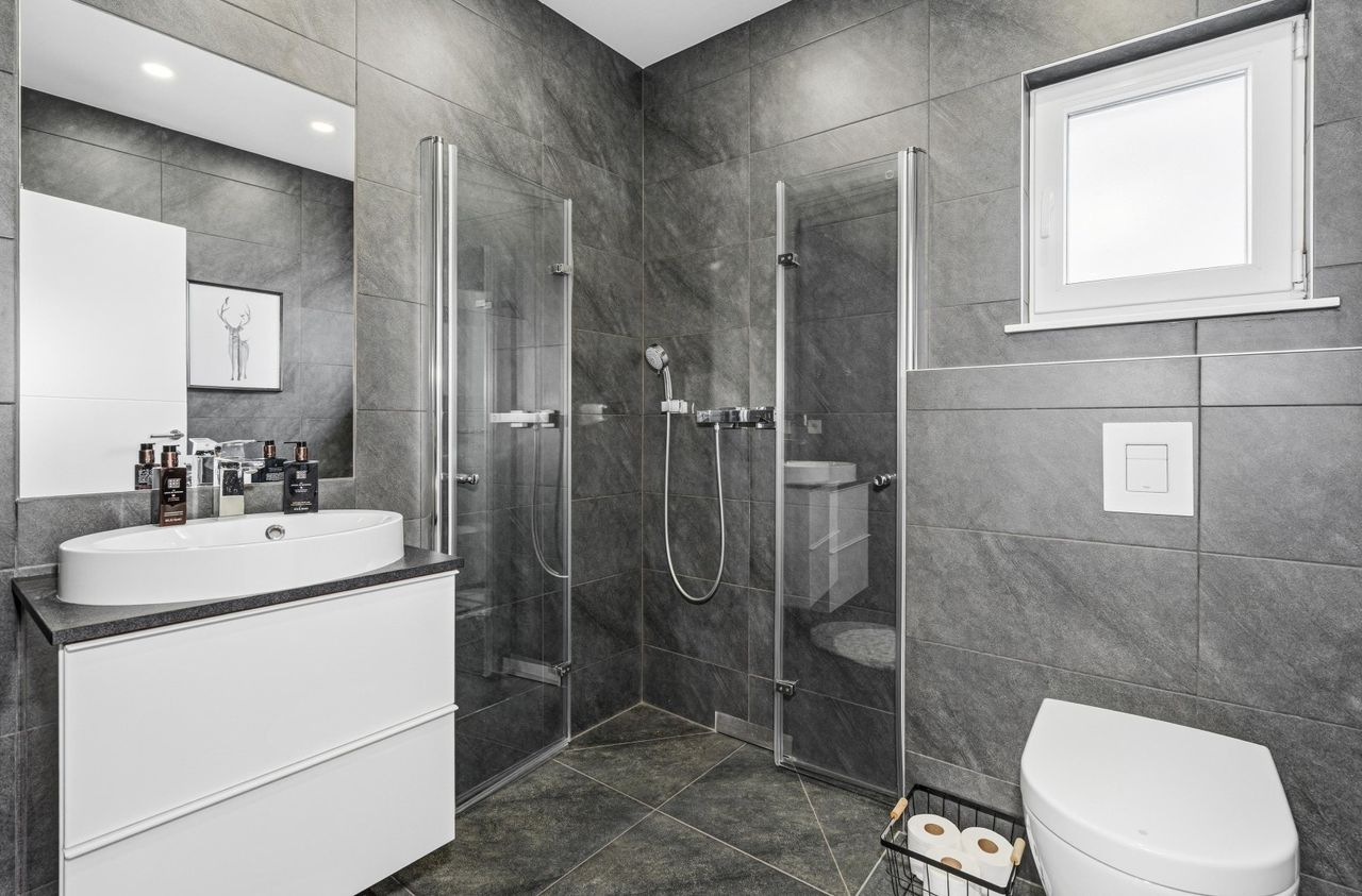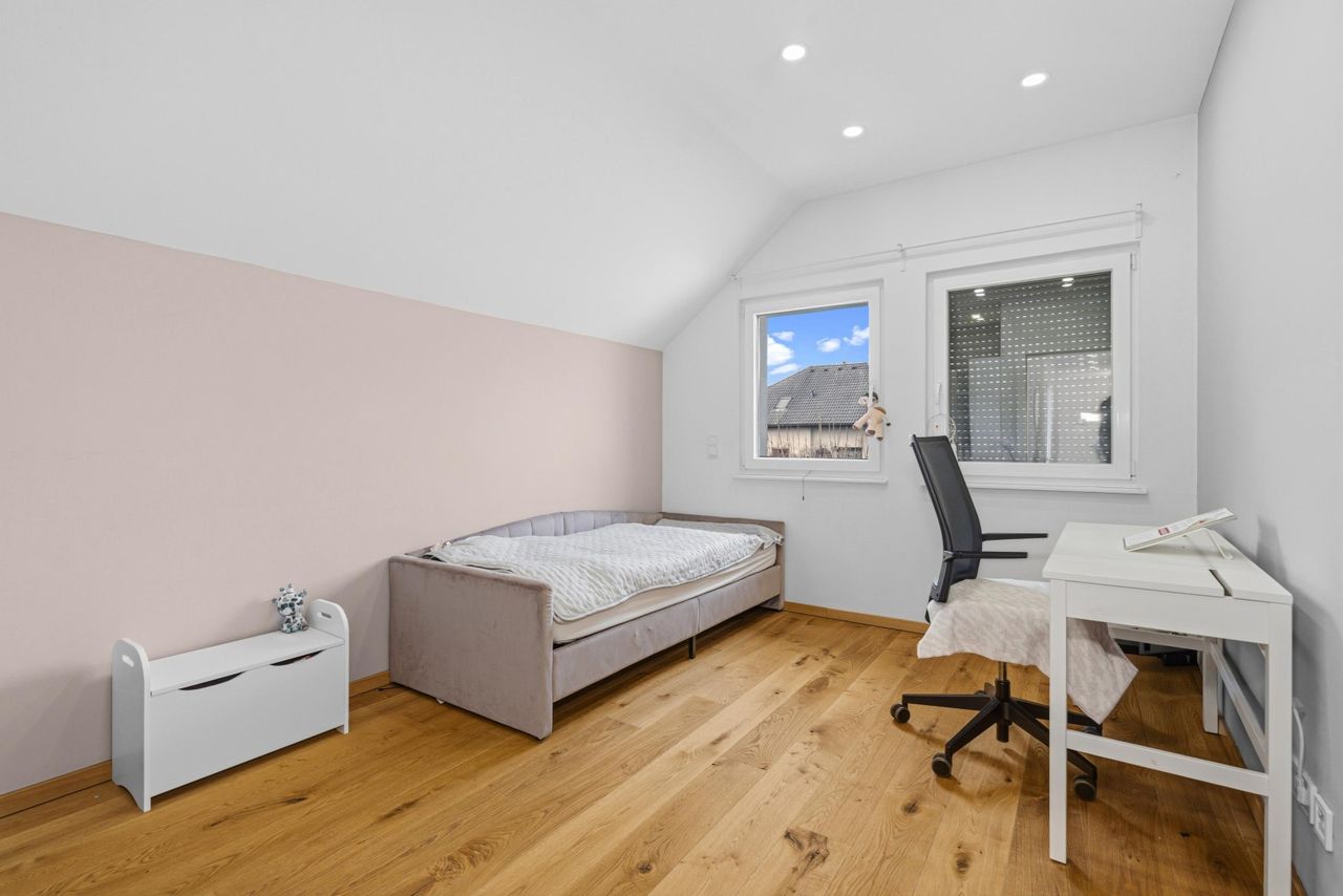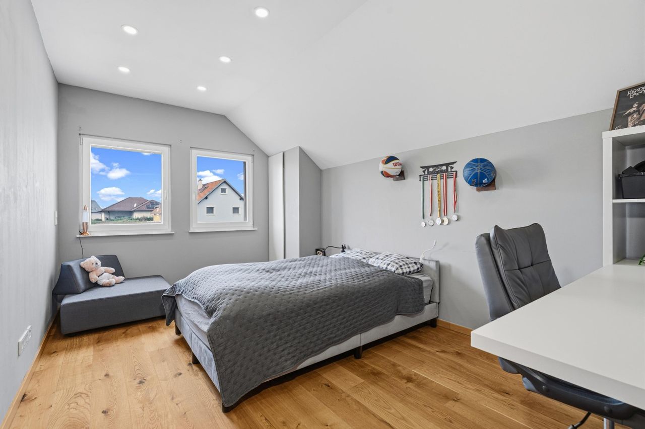 Im Obergeschoss erwarten Sie ein Schlafzimmer mit eigener Terrasse (ca. 6,75 m²), zwei Kinderzimmer sowie ein Büro. Das großzügige Badezimmer mit Fenster verfügt über eine ebenerdig-begehbare Dusche und eine Badewanne. Ein besonderes Detail ist die praktische Wäscherutsche, die vom Badezimmer direkt in die Waschküche in den Keller führt.