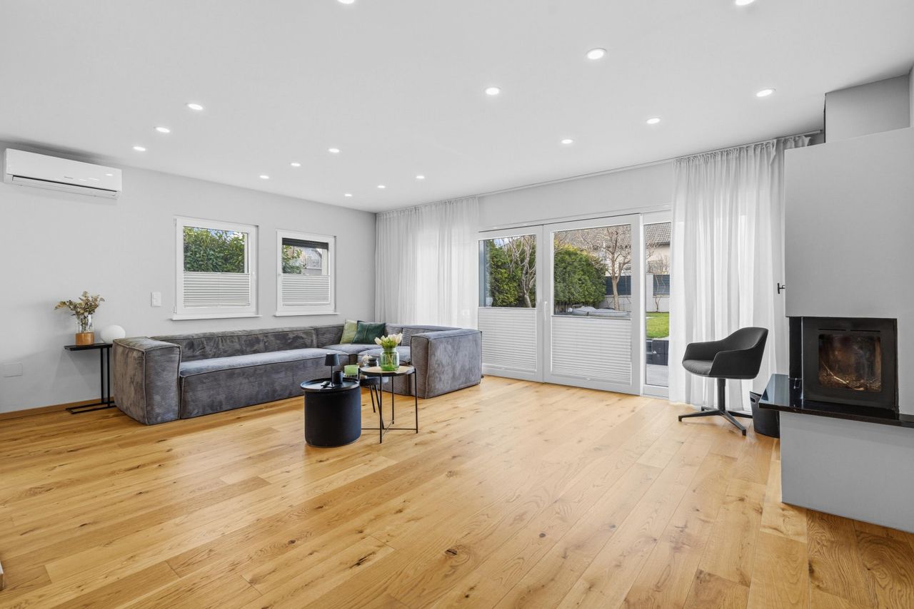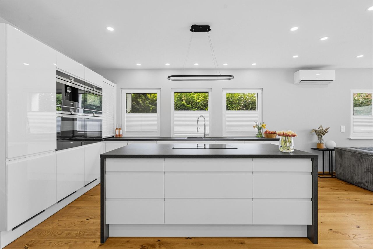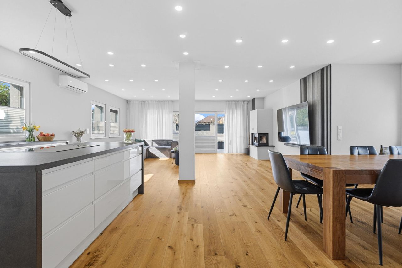 Das Herzstück des Hauses bildet das großzügige, zentral gelegene Wohnzimmer mit integrierter Küche und einer Fläche von rund 62 m². Der offene Wohn- und Essbereich schafft eine helle und einladende Atmosphäre und bietet direkten Ausgang auf die Terrasse sowie zur überdachten Outdoor-Küche – ideal für gesellige Abende und entspanntes Wohnen im Freien. Zusätzlich befinden sich im Erdgeschoss ein weiterer Schrankraum sowie ein modernes Gäste-Bad mit WC.