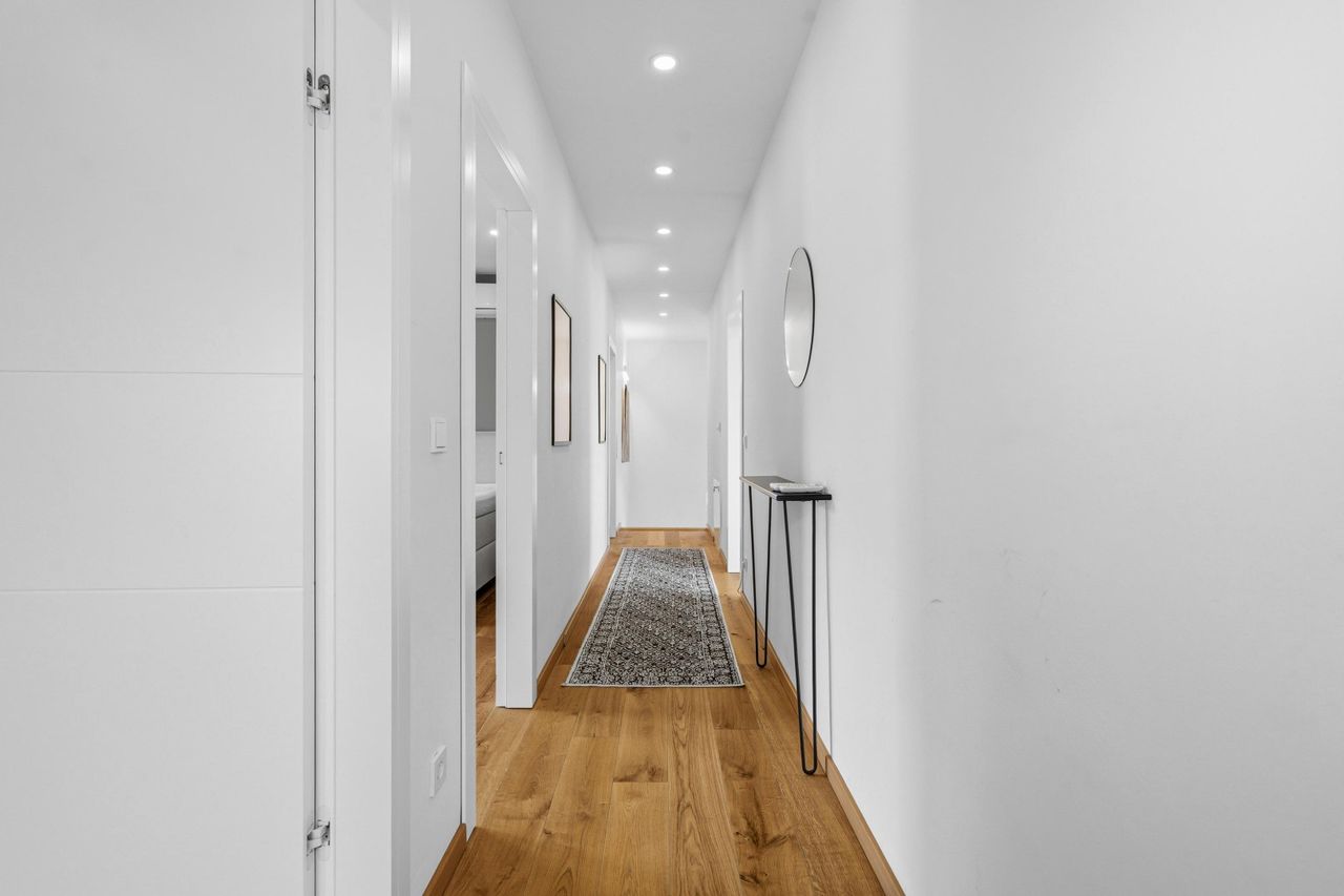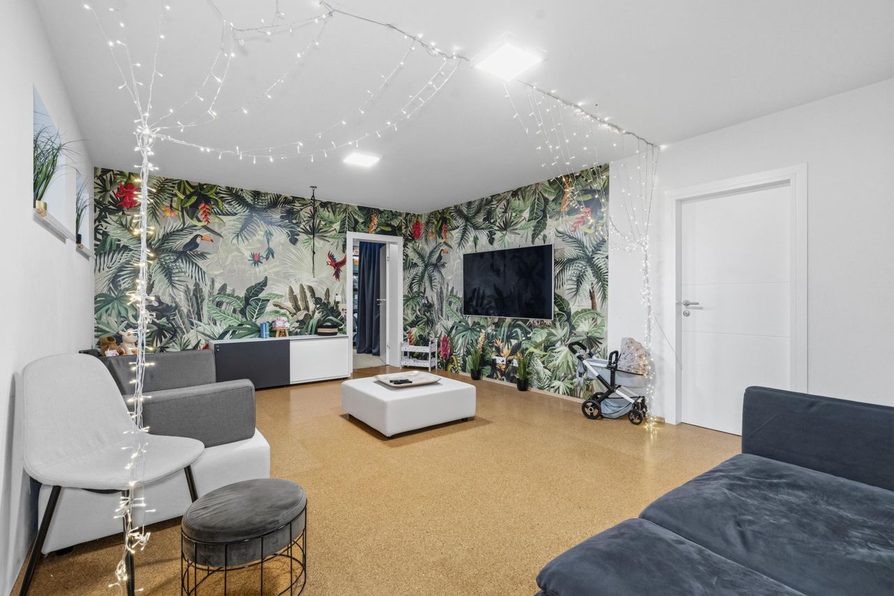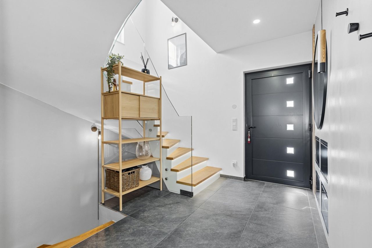Das Herzstück des Hauses bildet das großzügige, zentral gelegene Wohnzimmer mit integrierter Küche und einer Fläche von rund 62 m². Der offene Wohn- und Essbereich schafft eine helle und einladende Atmosphäre und bietet direkten Ausgang auf die Terrasse sowie zur überdachten Outdoor-Küche – ideal für gesellige Abende und entspanntes Wohnen im Freien. Zusätzlich befinden sich im Erdgeschoss ein weiterer Schrankraum sowie ein modernes Gäste-Bad mit WC.