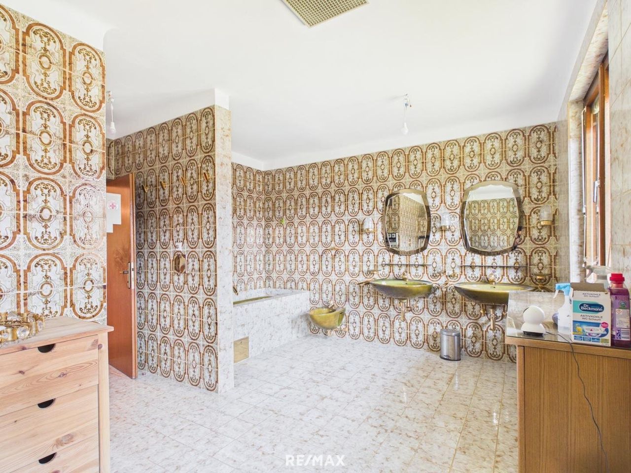 Zusätzlich befinden sich auf dieser Ebene ein großes Bad mit Badewanne, Bidet, Dusche sowie integrierter Sauna, die dem Haus einen besonderen Freizeit- und Erholungswert verleiht. Eine separate Toilette rundet das Angebot ab. Das Badezimmer und das WC stammen aus der Bauzeit und wurden mit viel Liebe zum Detail gestaltet. Damals wurde großer Wert auf Qualität und Handarbeit gelegt – selbst kleine Elemente sind maßgefertigt, wie zum Beispiel der hölzerne Handtuchhenkel. Solche Details verleihen den Räumen einen besonderen Charme und zeigen den hohen Anspruch, mit dem das Haus ursprünglich ausgestattet wurde.