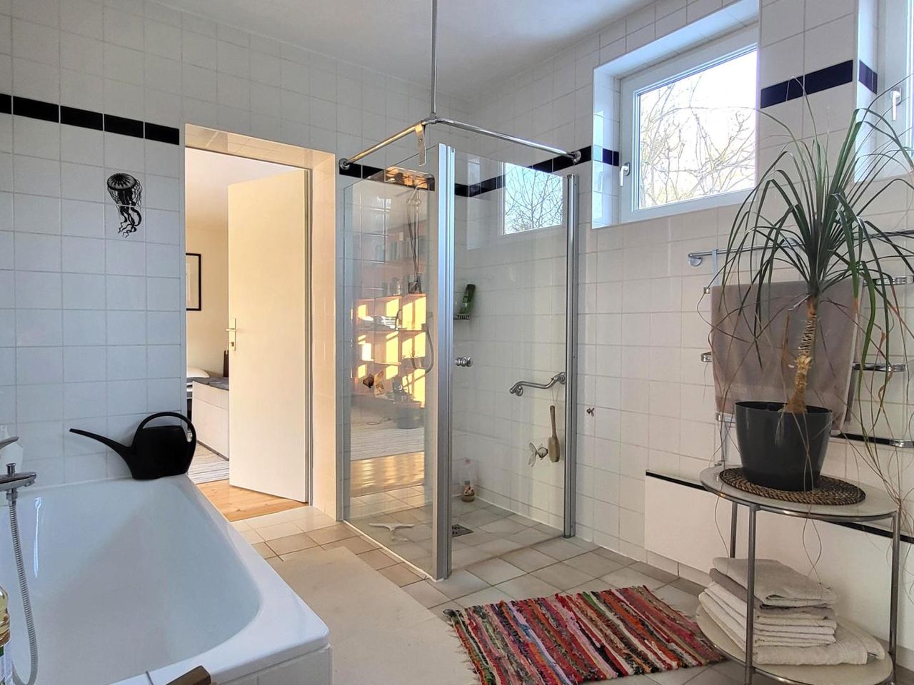 WOHNGEBÄUDE: Zugang zum Vorraum, separates WC, barrierefreies Badezimmer, mit Badewanne, Dusche, Waschbecken und Waschmaschine, Küche mit Elektroherd, Spüle und Kühlschrank, Wohnraum mit Schwedenofen, Schlafzimmer, Durchgangszimmer mit Gartenzugang, ein weiteres Schlafzimmer.
