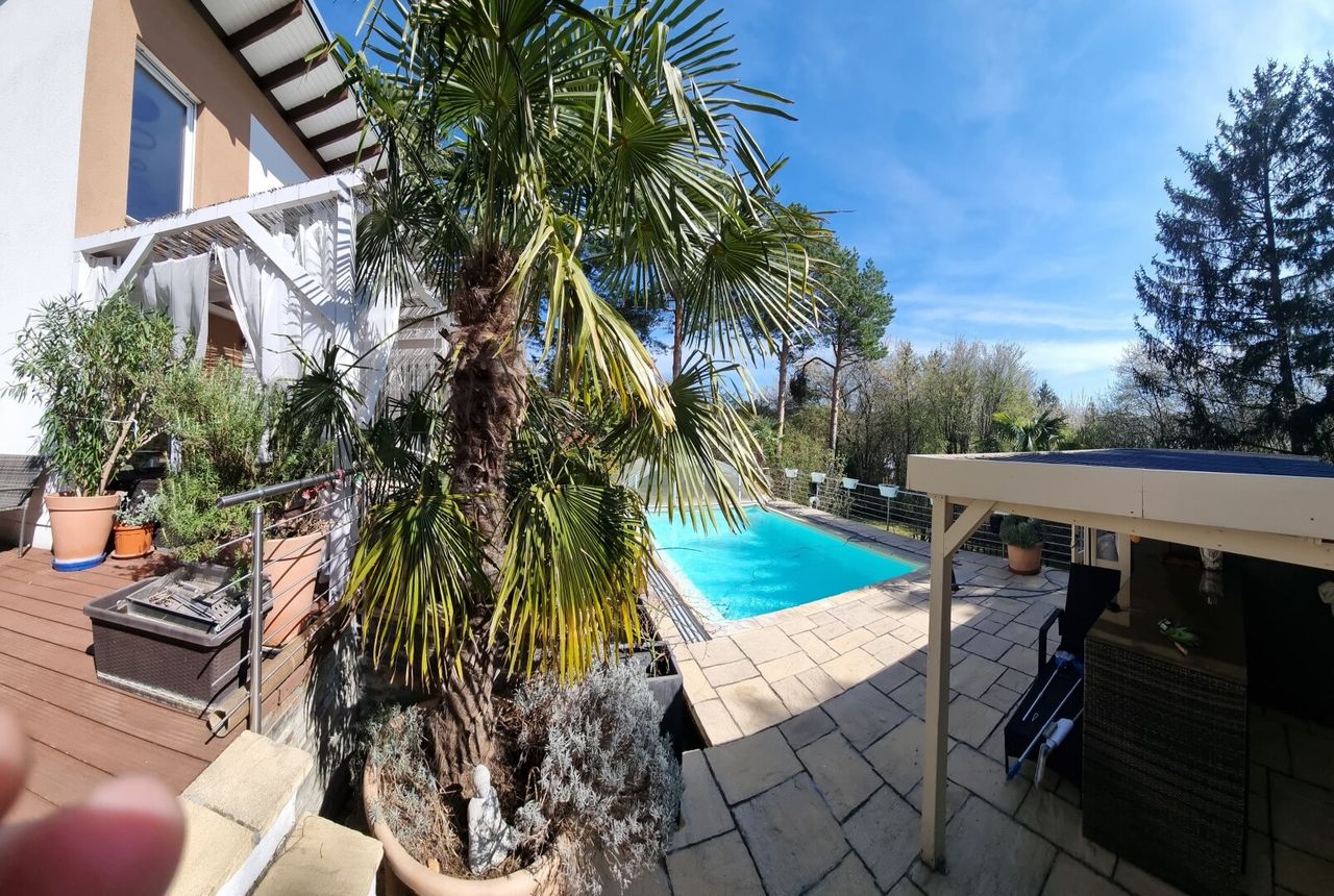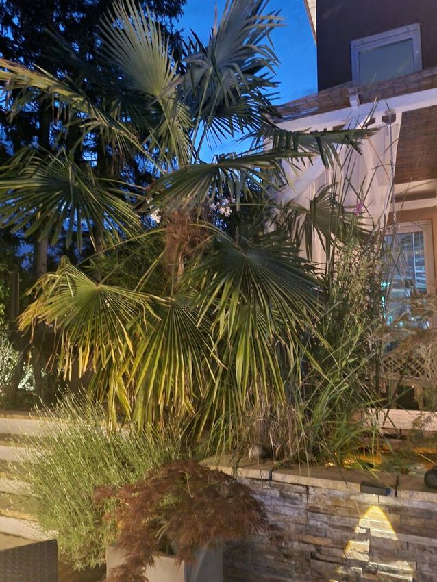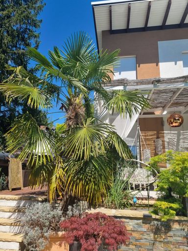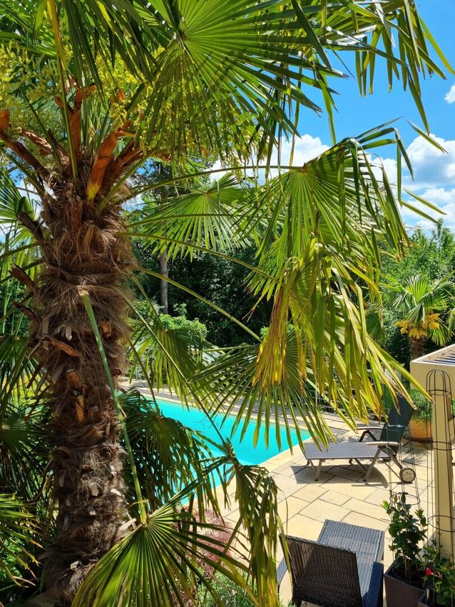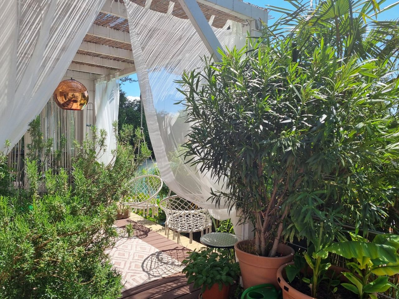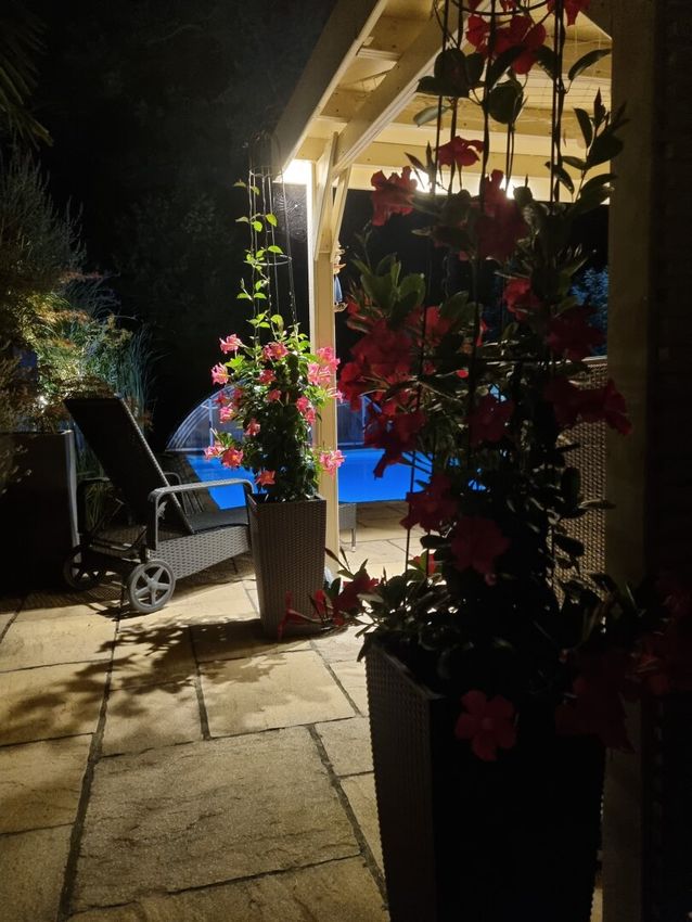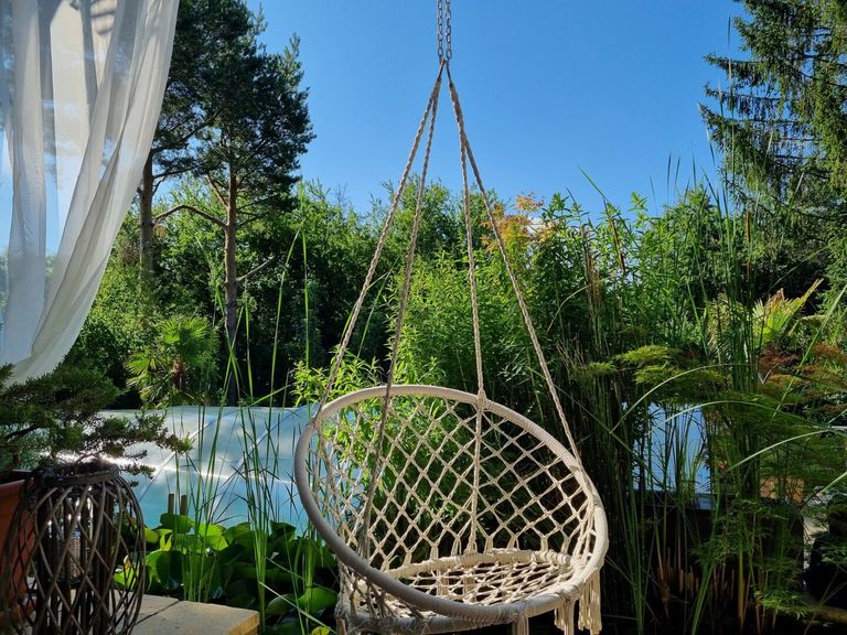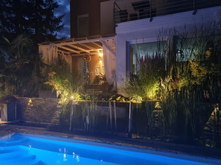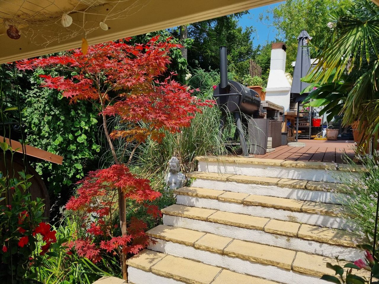 Eine weitere Terrasse auf dem Grundstück überzeugt mit einer charmanten, schattenspendenden Gartenlaube, die selbst an heißen Sommertagen einen angenehmen Rückzugsort bietet. Zusätzlich erwartet Sie ein exklusiver Wellnessbereich mit Sauna, Außendusche und Whirlpool.