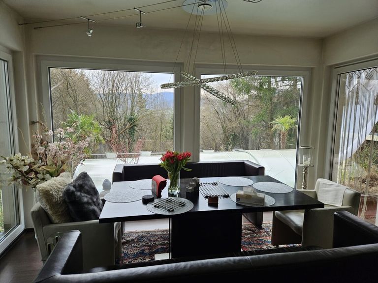 Von der Küche aus betritt man den großzügigen Wintergarten: Dieser bietet ausreichend Platz für eine große Tafel mit bis zu 20 Sitzplätzen – ideal für gesellige Abende und repräsentative Anlässe. Daran grenzt die weitläufige Terrasse mit exklusiver Grillstation - ausgestattet mit Smoker, Gas- und Holzkohlegrill wird sie höchsten Ansprüchen an Outdoor-Kulinarik gerecht.