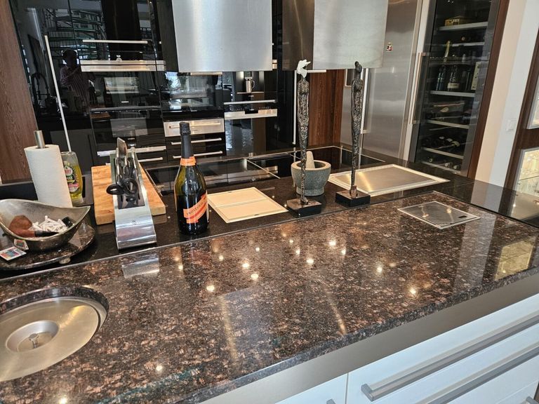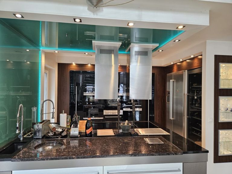 Die großzügige Kochinsel mit Induktions-, Ceran- und Teppanyaki-Kochflächen, zwei Abwaschbereichen, zwei leistungsstarken Dunstabzügen und edlen Naturstein-Arbeitsplatten schafft ein Kocherlebnis auf Spitzenniveau. Flächenbündig integrierte Geräte, perfekt platzierte Deckeneinbaustrahler und großzügig bemessener Stauraum verbinden hier Design mit Funktionalität.