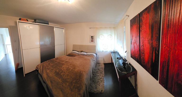 Das Hauptschlafzimmer ist Richtung Garten ausgerichtet und verfügt über einen direkten Zugang zur angrenzenden Terrasse. Ein großzügig bemessenes Ankleidezimmer mit viel Stauraum führt in das angrenzende, elegante Tageslicht-Badezimmer, das mit einer Badewanne mit Whirlpool ausgeführt und mit hochwertigen Badmöbeln ausgestattet ist. Eine Infrarotheizung sorgt zusätzlich für Komfort.